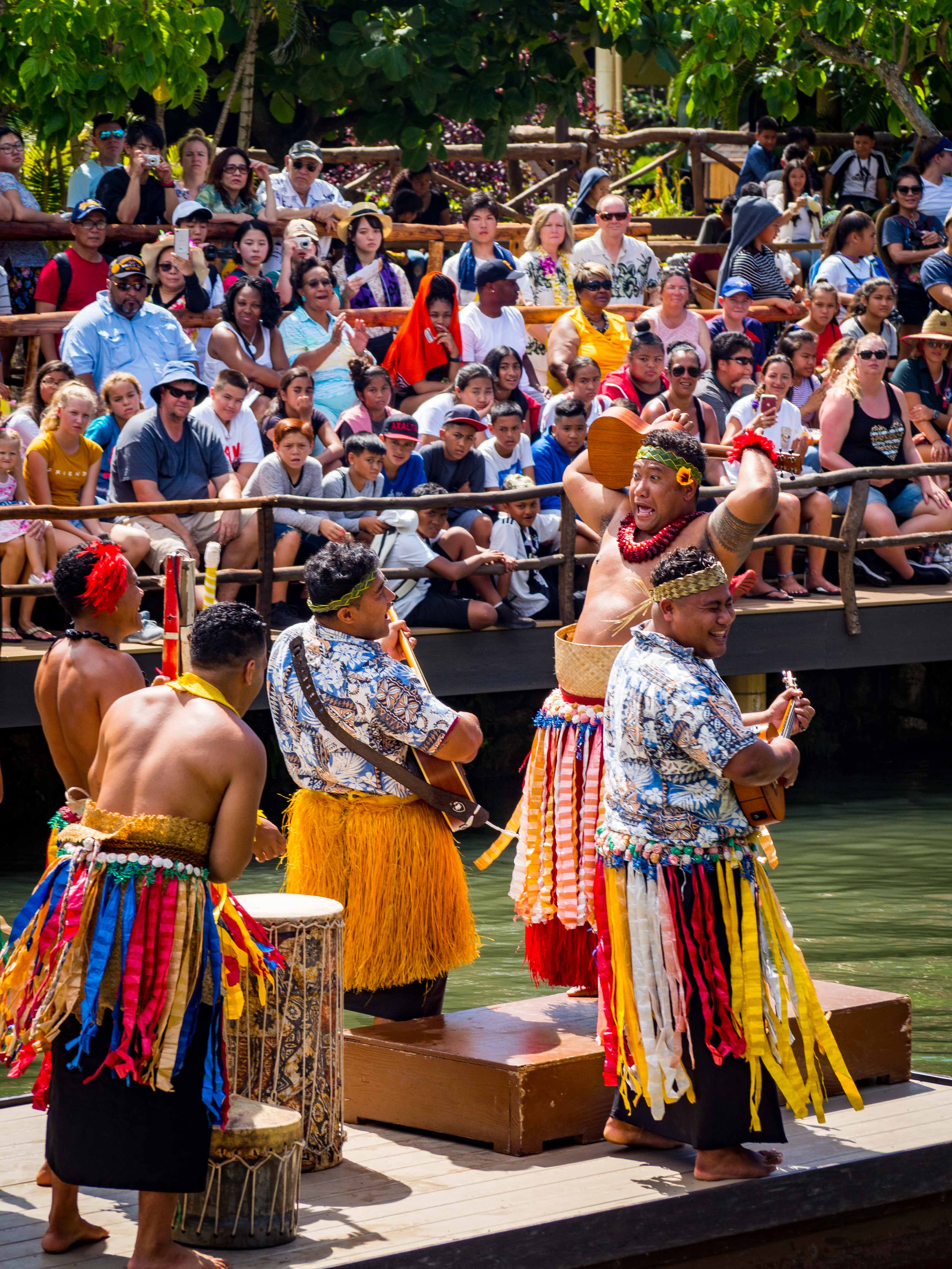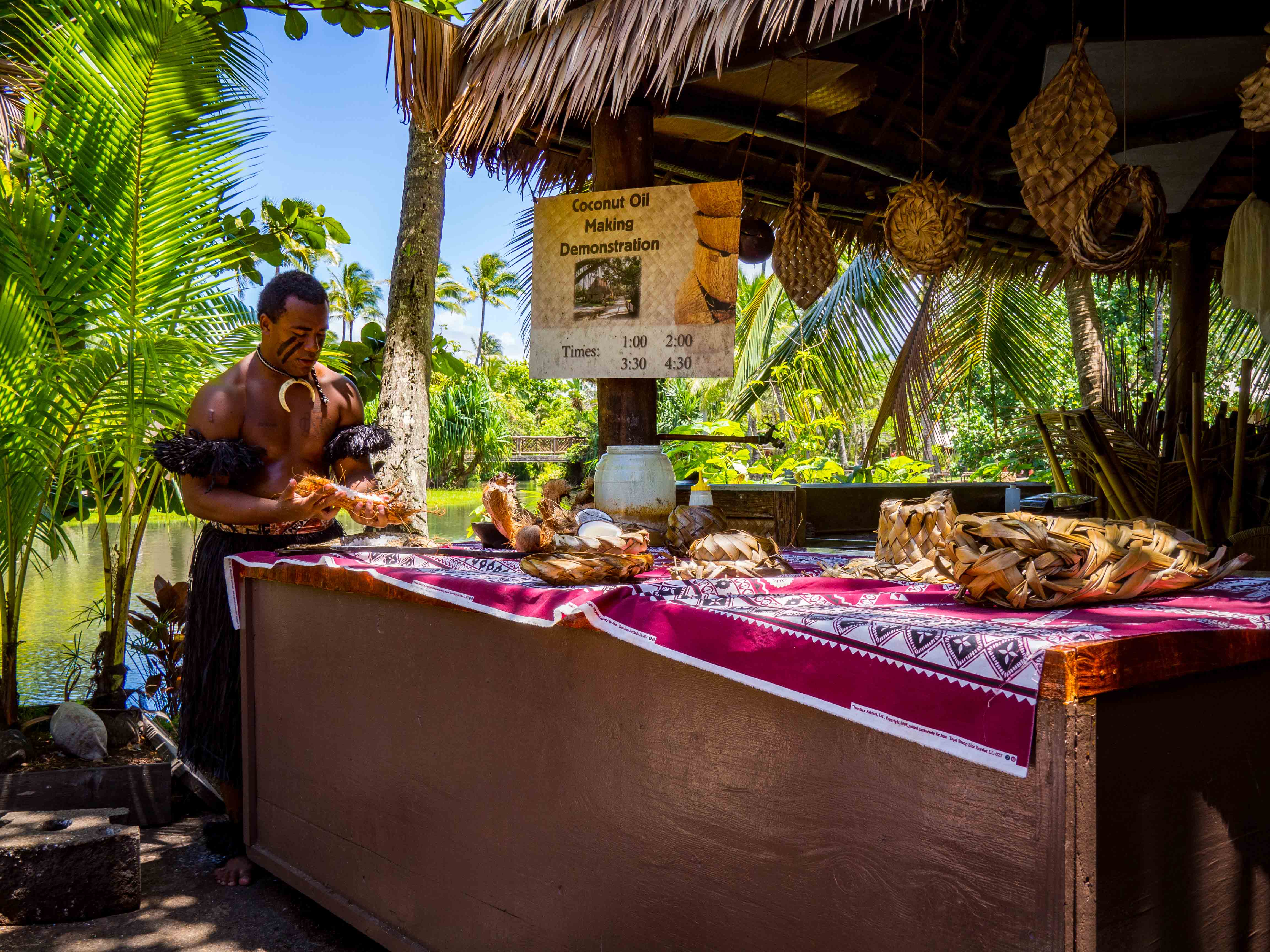 Całe centrum podzielone jest na kilka polinezyjskich wiosek: Fidżi, Tonga, Tahiti, Samoa, Aoteroa (Maorysi z Nowej Zelandii) oraz Hawaje. W każdej z nich regularnie odbywają się przedstawienia związane z kulturą poszczególnych ludów, w przerwie których uczestniczyć można w interaktywnych warsztatach. I tak nauczyliśmy się m.in. jak rozpalać ogień pocierając drewnem hibiskusa o drewno, zarzucić sieć na ryby, przygotować olej kokosowy, czy też jak tańczyć hawajski taniec hula. Wejściówka do centrum obowiązuje trzy dni – my spędziliśmy dwa popołudnia intensywnie je eksplorując, a i tak przydałoby nam się odrobinę więcej czasu. W tym kontekście astronomiczna cena staje się jeszcze do przełknięcia.
