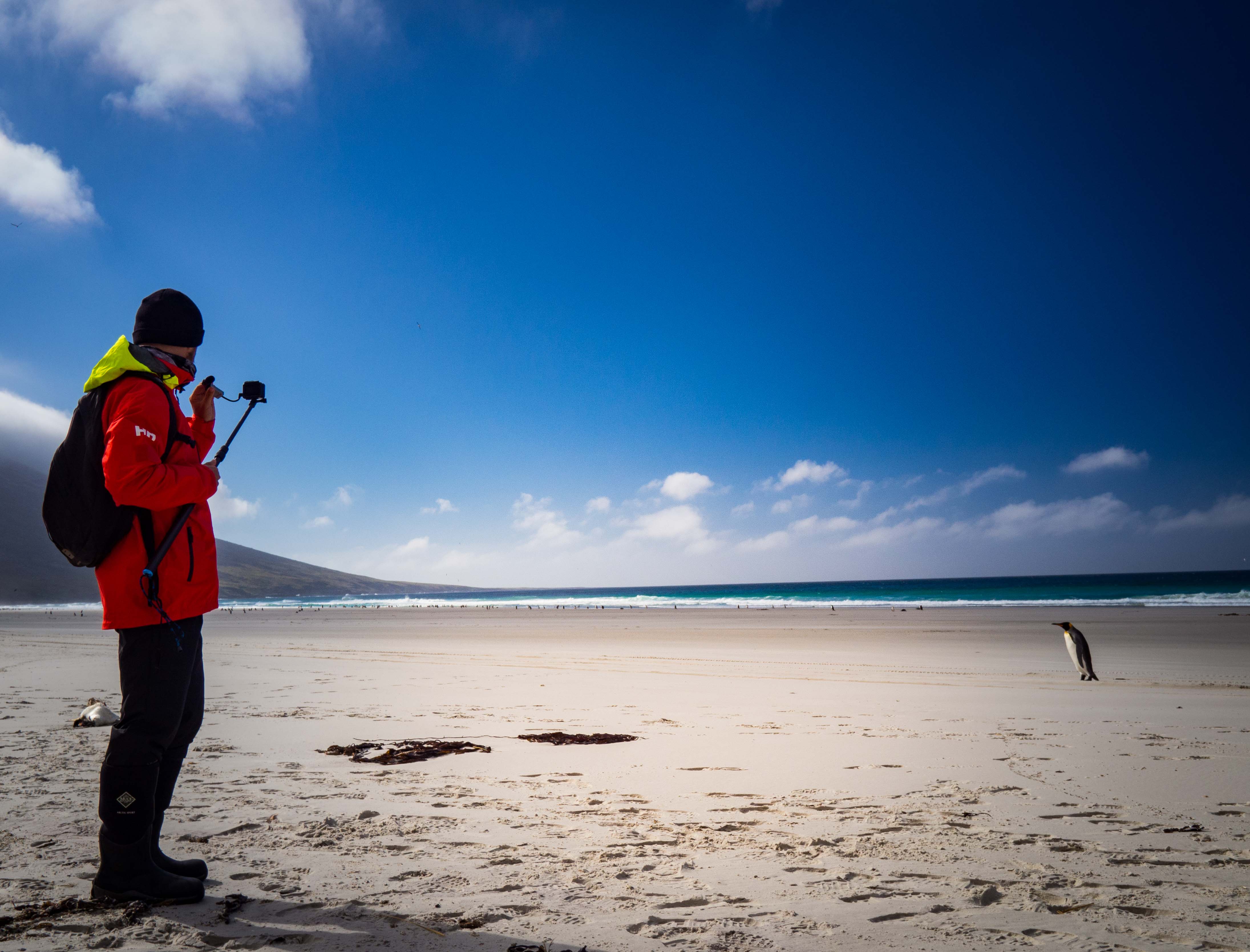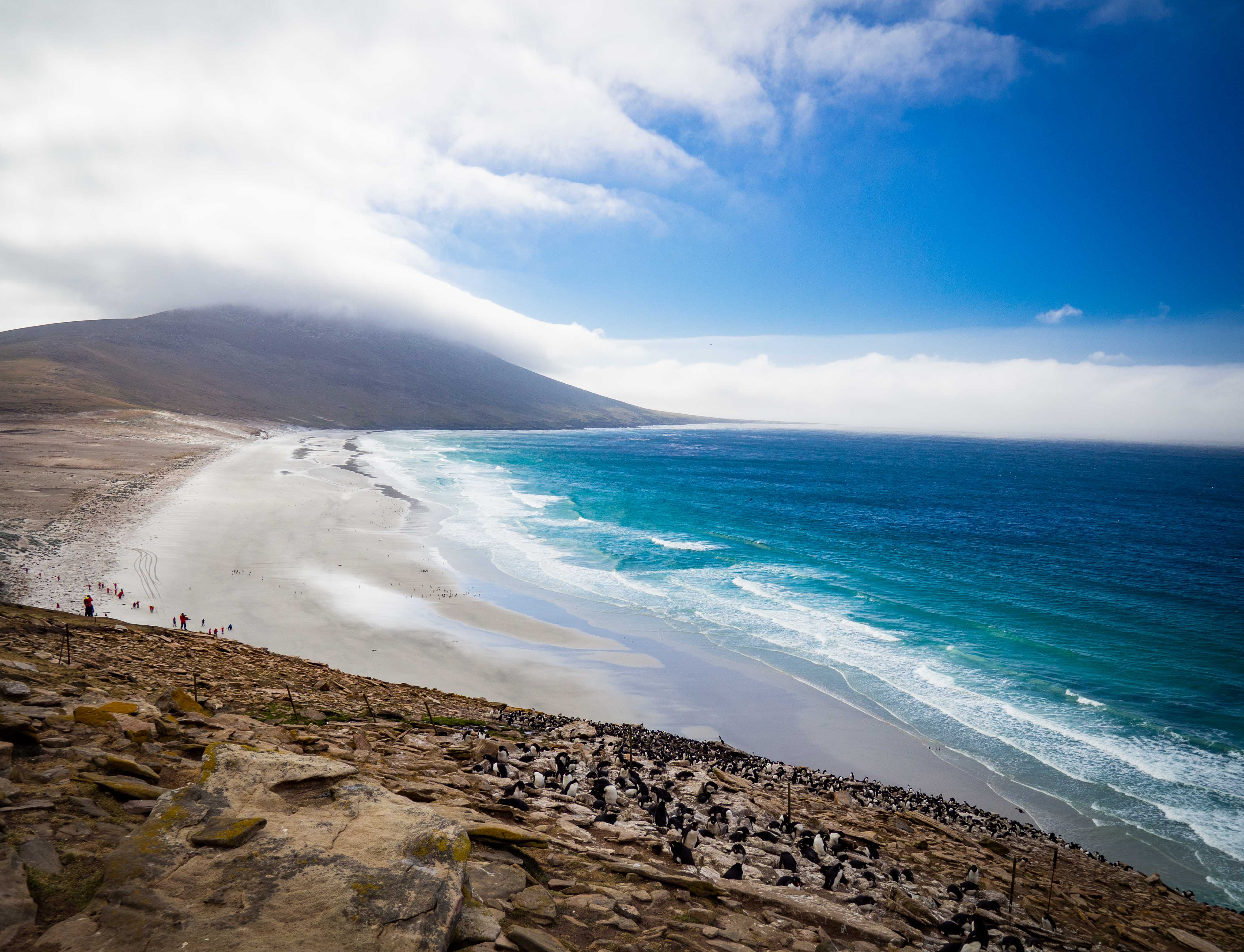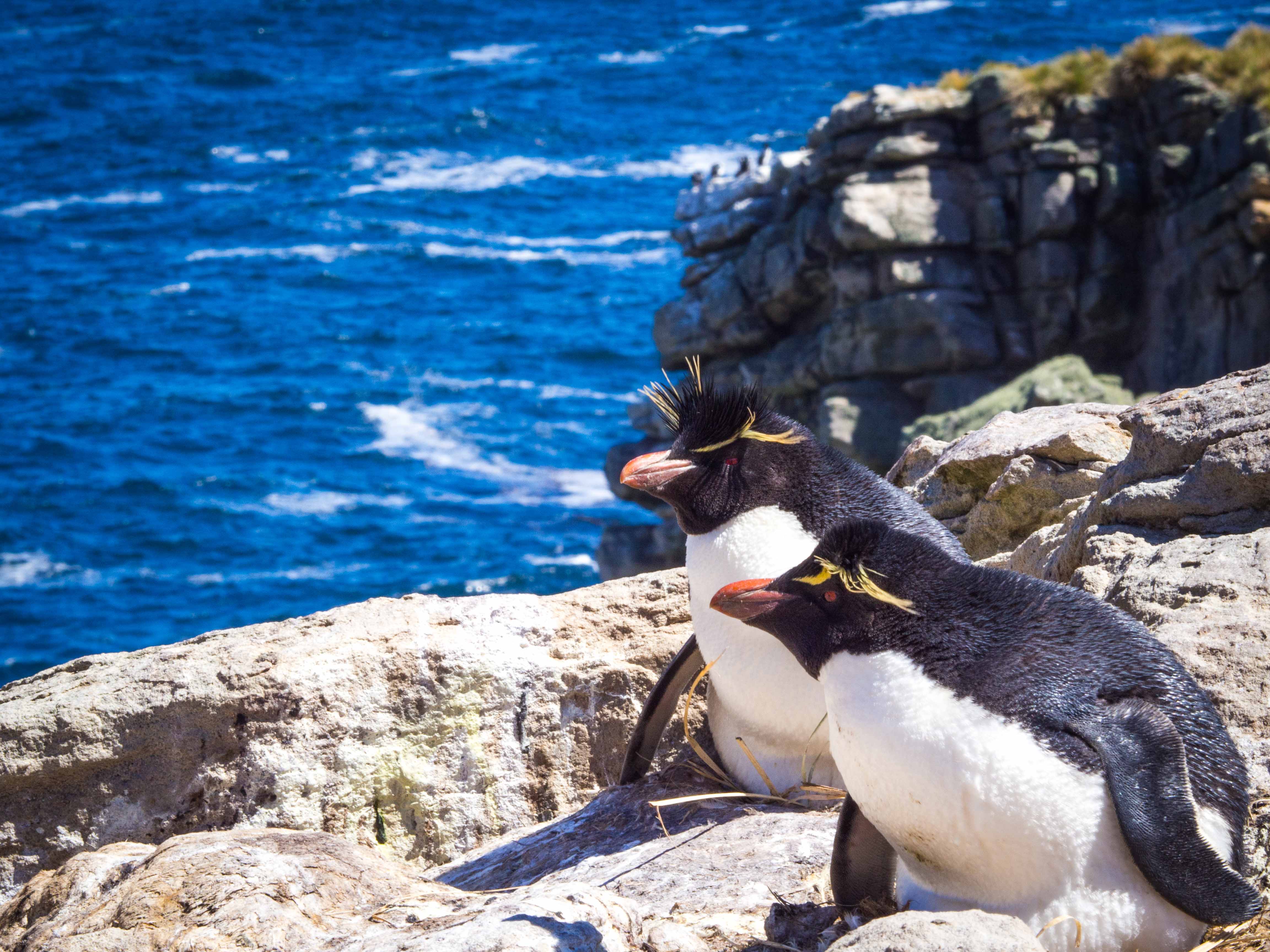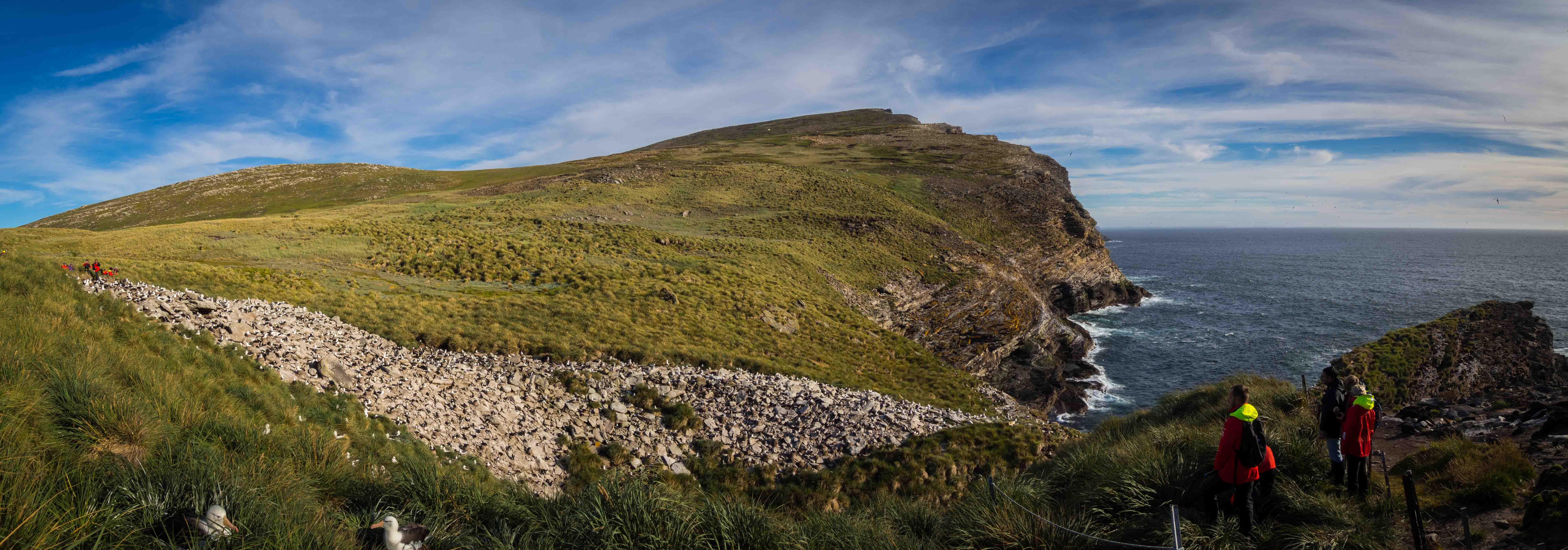 Budzimy się z widokiem na Falklandy. Pierwszym przystankiem jest wysepka New Island. W odróżnieniu od reszty grupy, która biegnie na jeden z klifów, gdzie mieści się siedlisko pingwinów skalnych zaraz po zejściu kierujemy się na punkt widokowy. Chcemy ich przechytrzyć i mieć pingwiny w całości dla siebie, w momencie gdy przyjdzie ich pora na wizytę na wzgórzu.