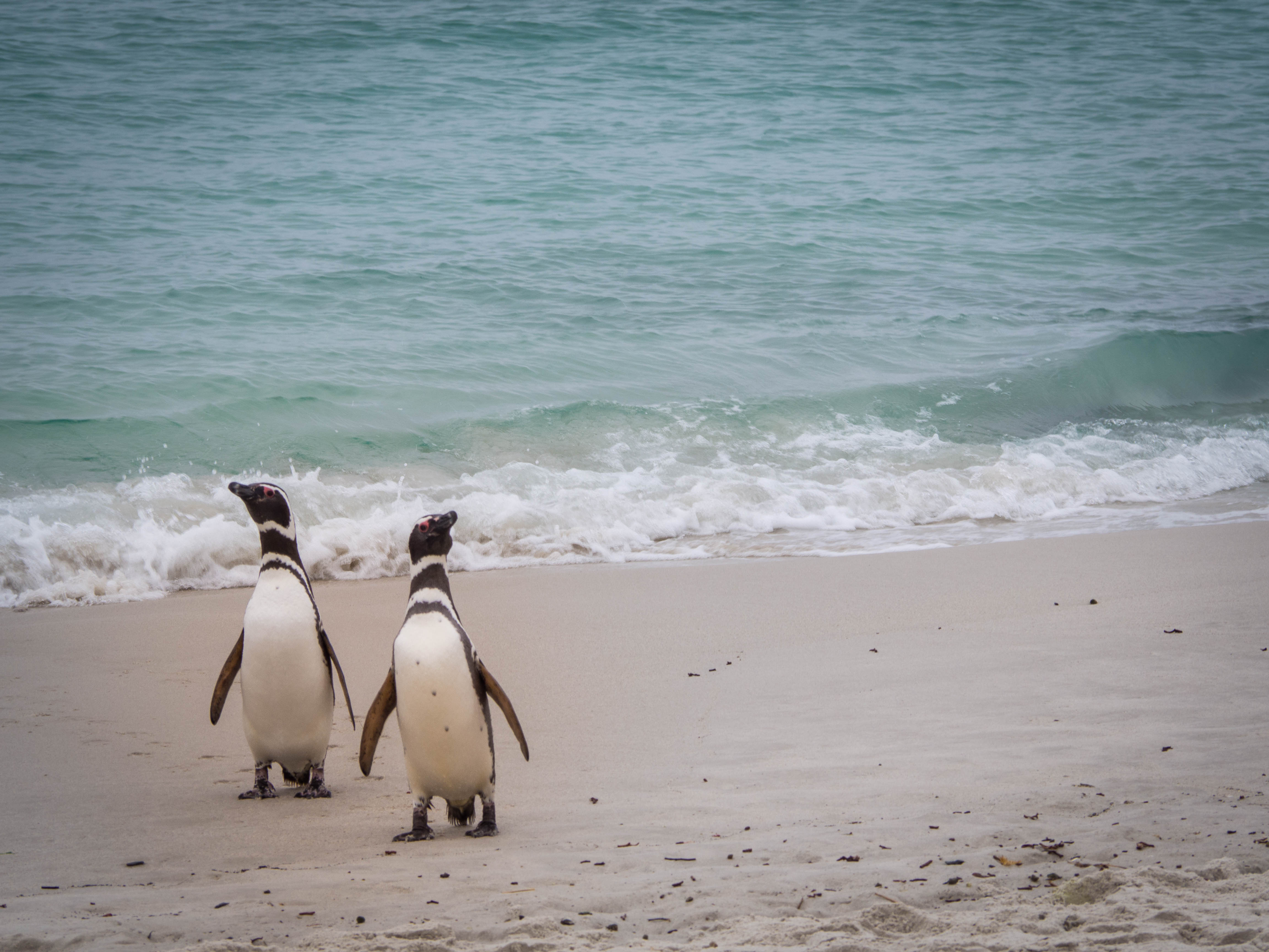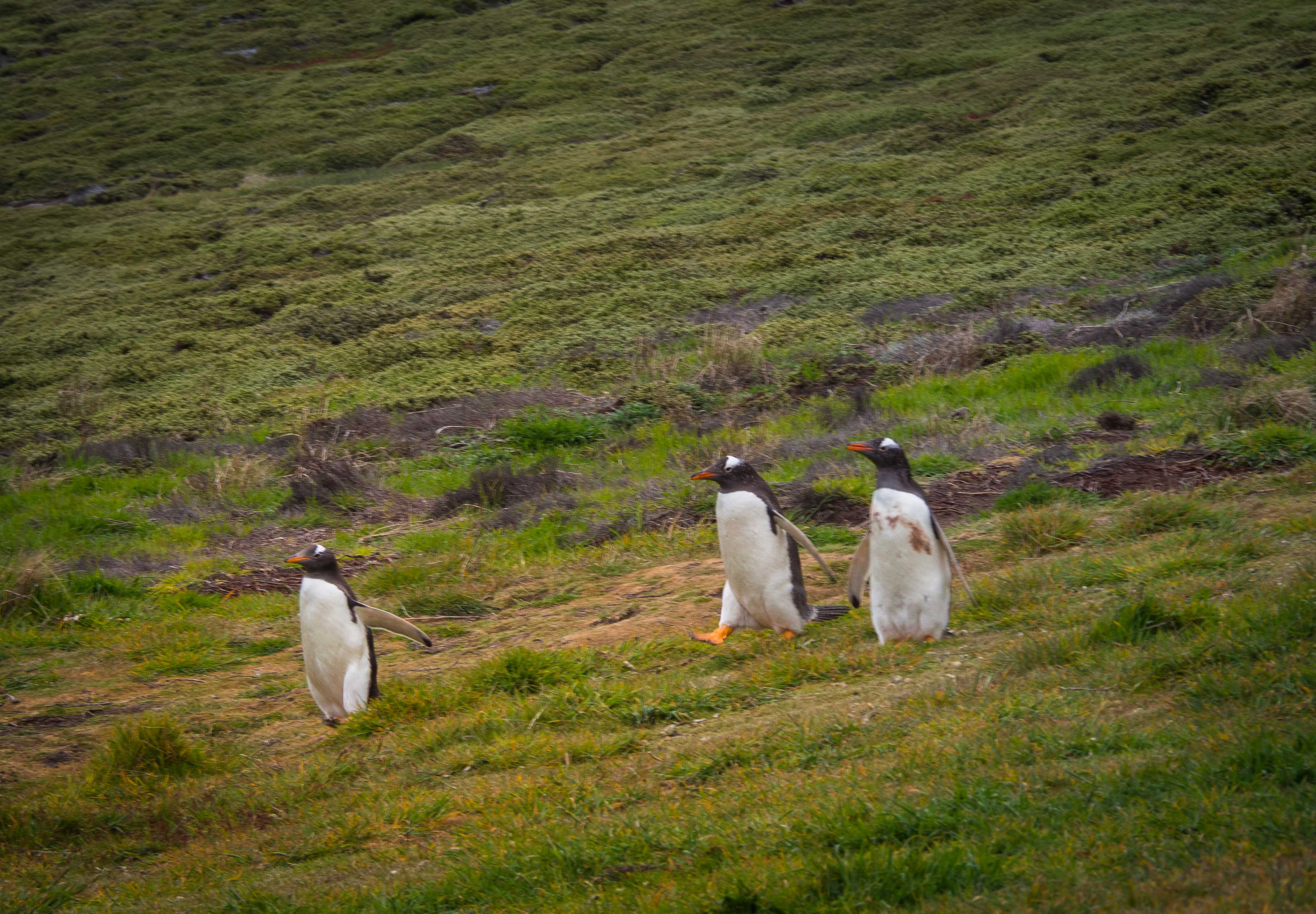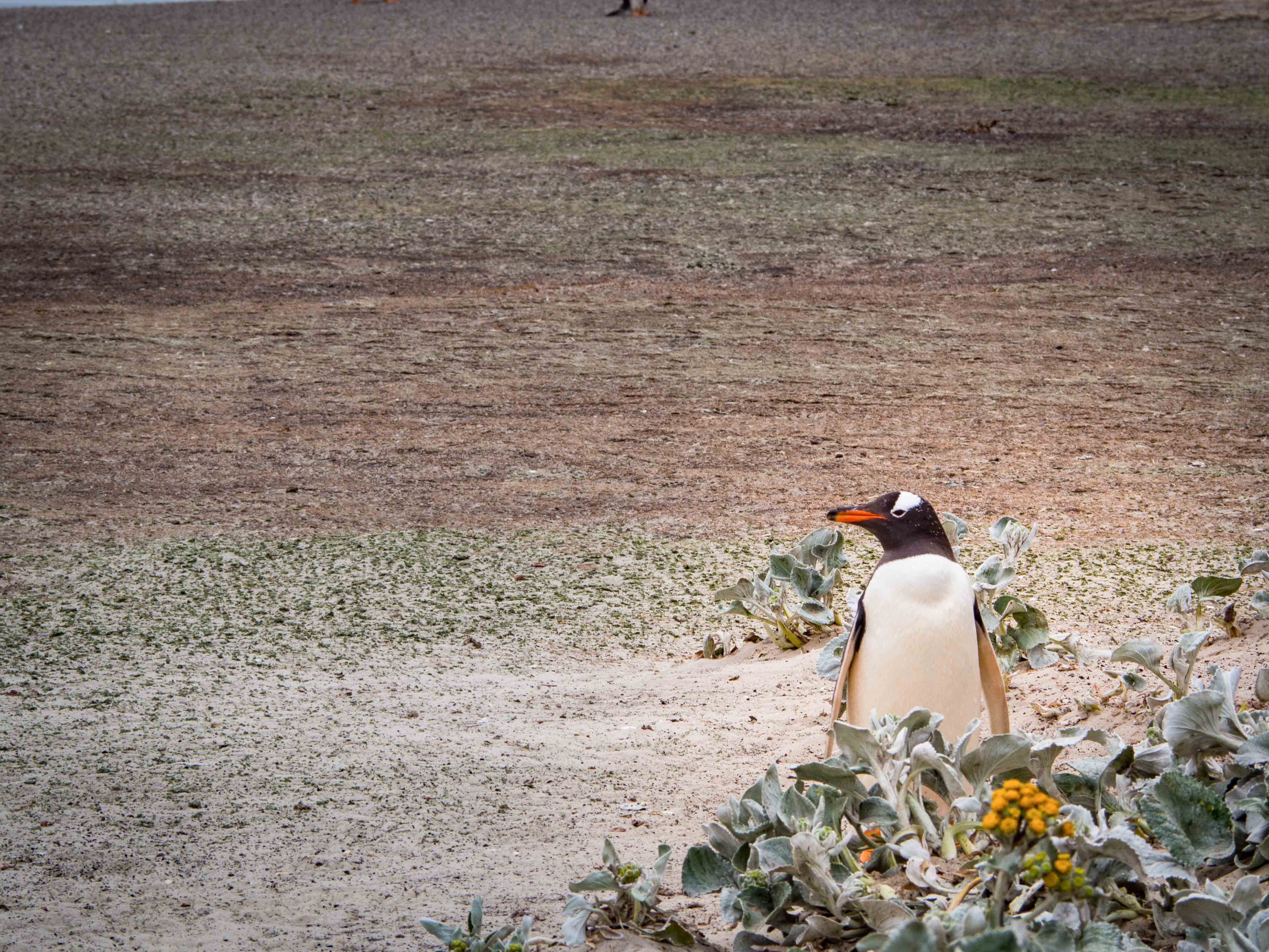 Kolejna pobudka, kolejna wyspa. Przyszła pora na Carcass Island, siedlisko pingwinów magellańskich. Zaraz po wyjściu na plażę spotykamy 2 osobniki przechadzające się po jednej z przyległych “łąk”. Pingwin magellański tworzy swoje gniazda w norach wykopanych w ziemi, stąd jesteśmy uczuleni, by chodzić wyłącznie po wytyczonym szlaku.