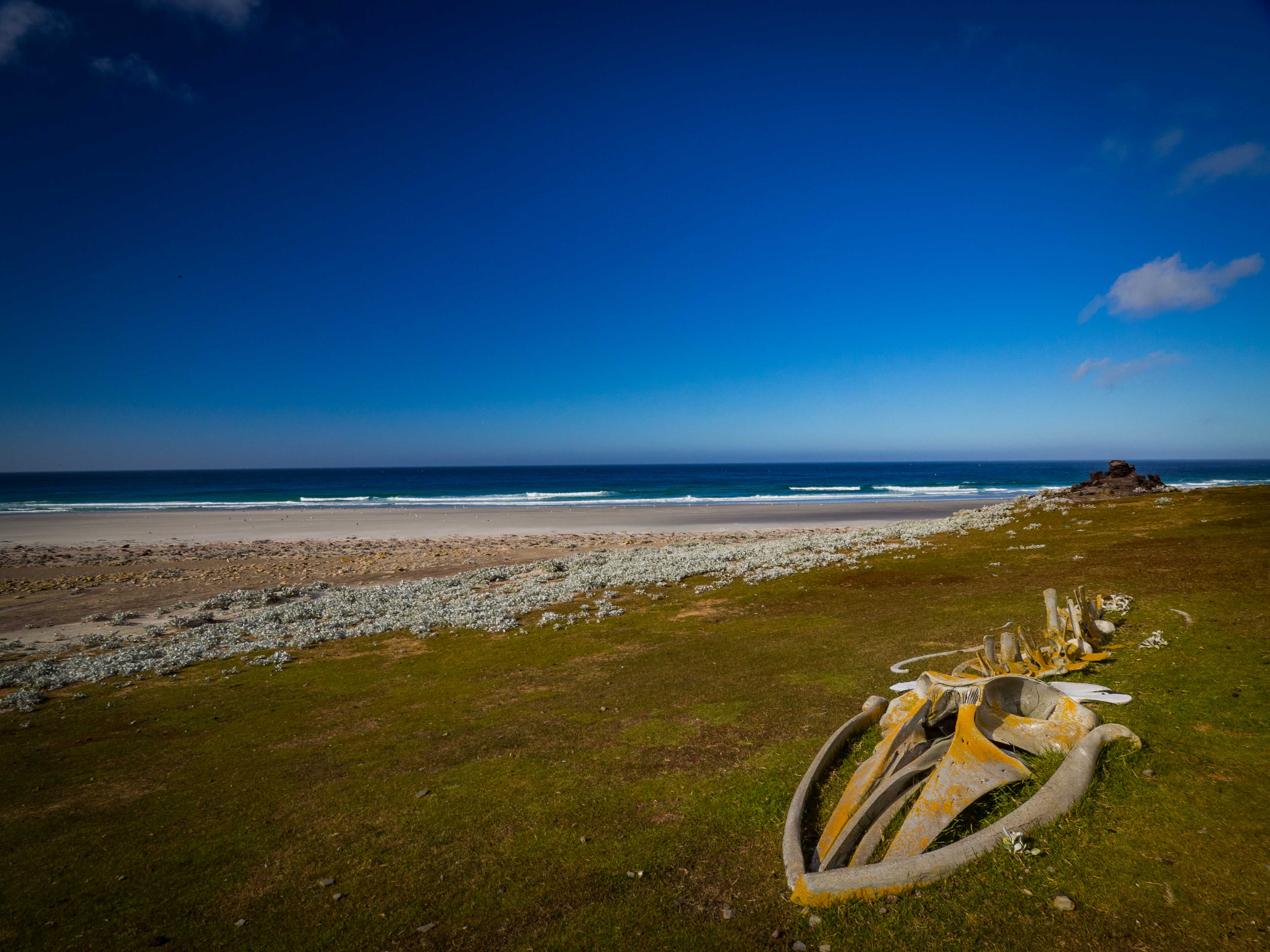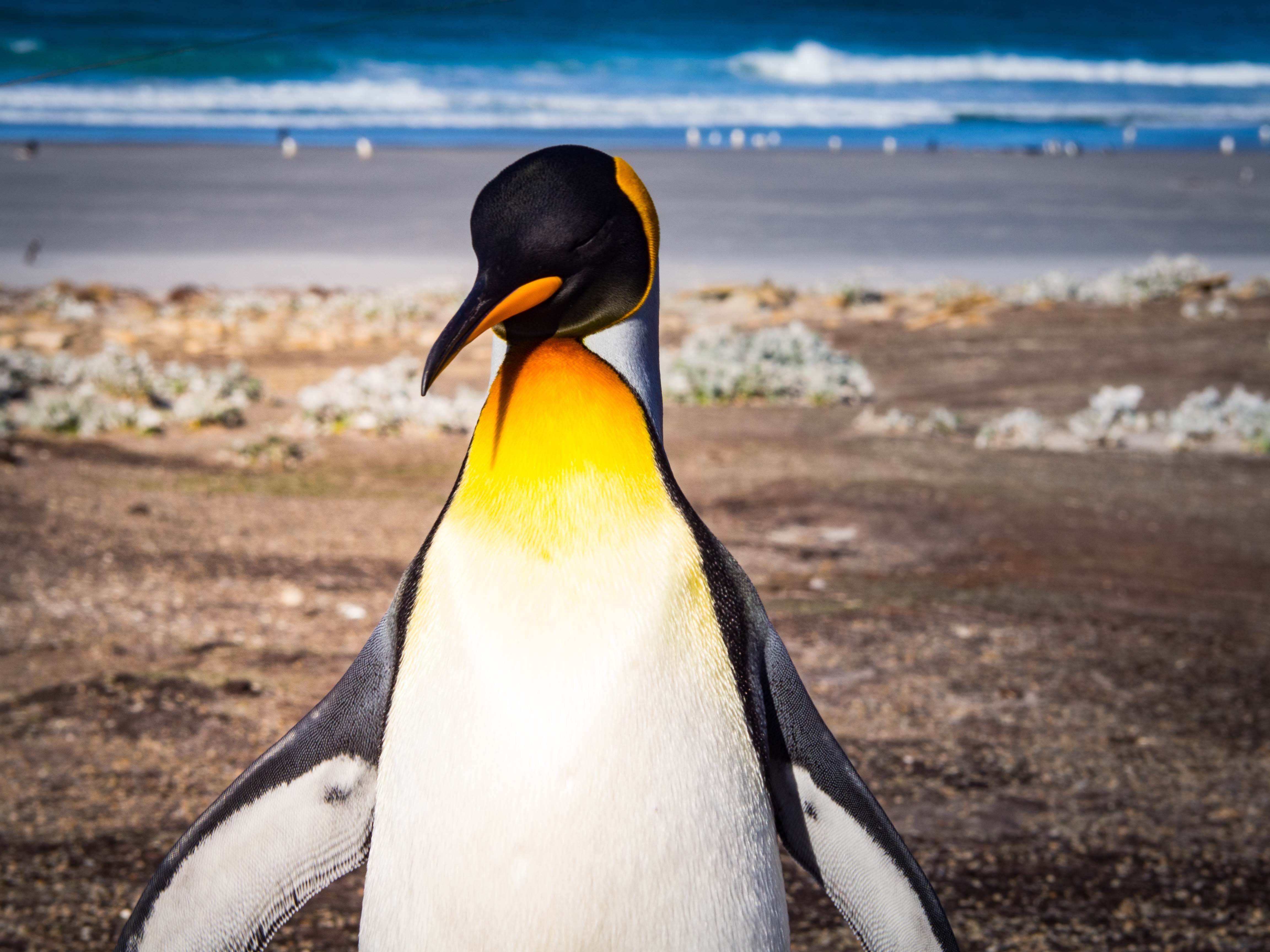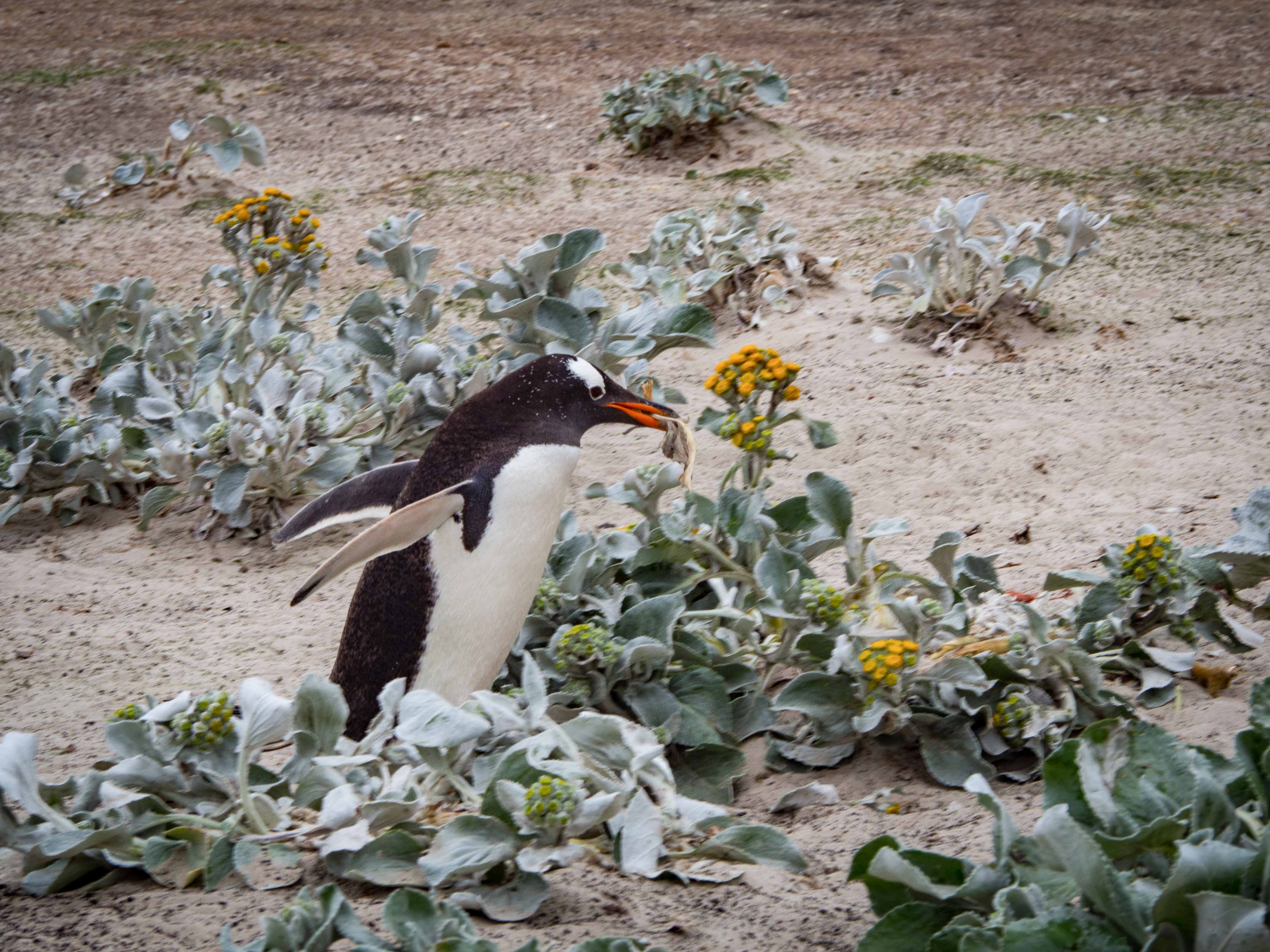 Kolejna pobudka, kolejna wyspa. Przyszła pora na Carcass Island, siedlisko pingwinów magellańskich. Zaraz po wyjściu na plażę spotykamy 2 osobniki przechadzające się po jednej z przyległych “łąk”. Pingwin magellański tworzy swoje gniazda w norach wykopanych w ziemi, stąd jesteśmy uczuleni, by chodzić wyłącznie po wytyczonym szlaku.