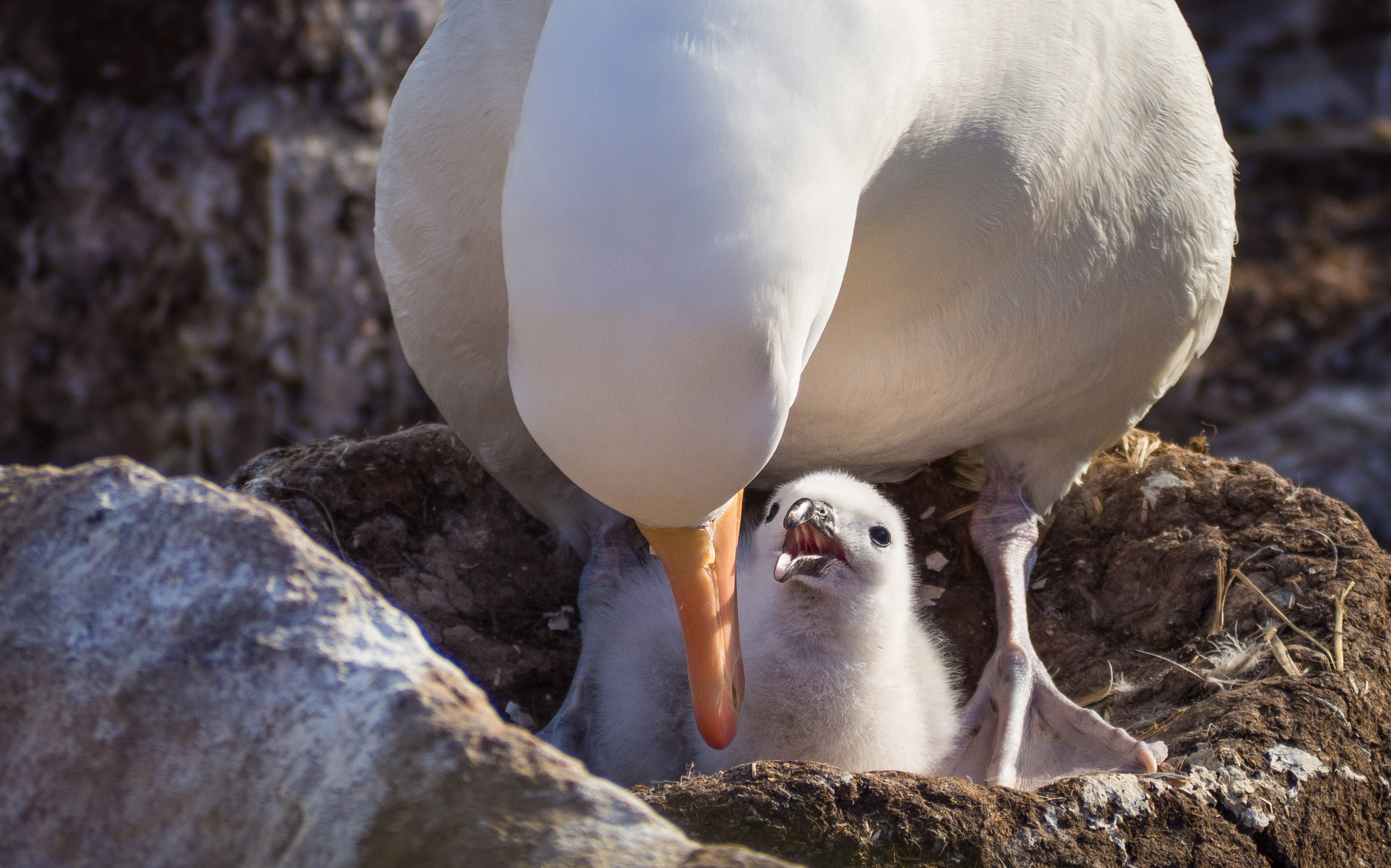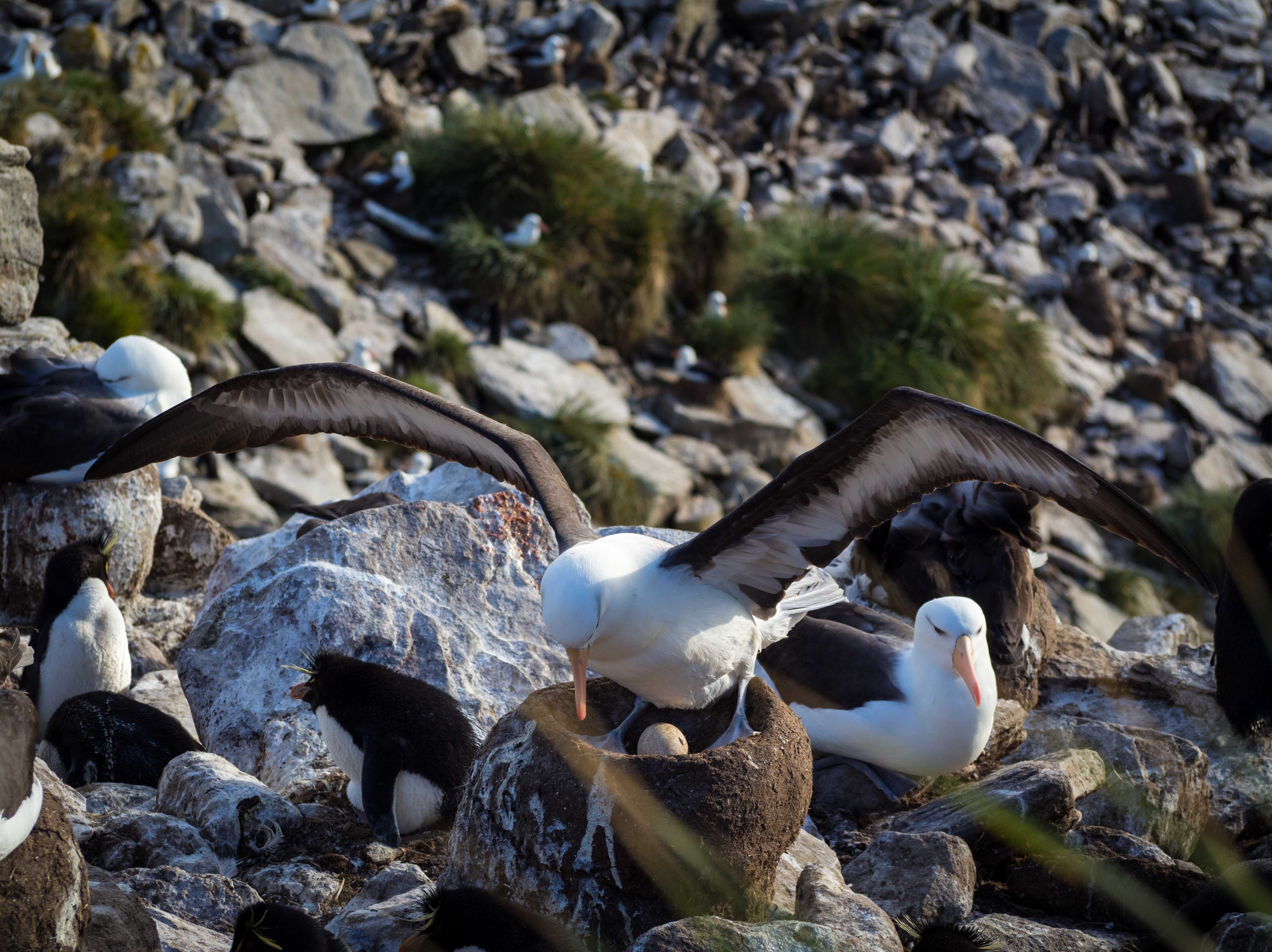 Popołudniowe zejście na West Point rekompensuje nam poranny niedosyt. Wędrujemy bezpośrednio do siedliska pingwinów skalnych i albatrosów czarnobrewych. Stoimy w zachwycie przez blisko godzinę, podglądając ich stadne życie. Zwierzęta nic sobie nie robią z obecności człowieka, który czasami stoi niecałe 2 metry od ich gniazda. Wisienką na dzisiejszym torcie był widok pisklaka wykluwającego się właśnie z jajka. Mały pingwin miał już wysuniętą główkę i skrzydełka, jednakże nie był jeszcze w stanie wyjść ze swojej skorupy.