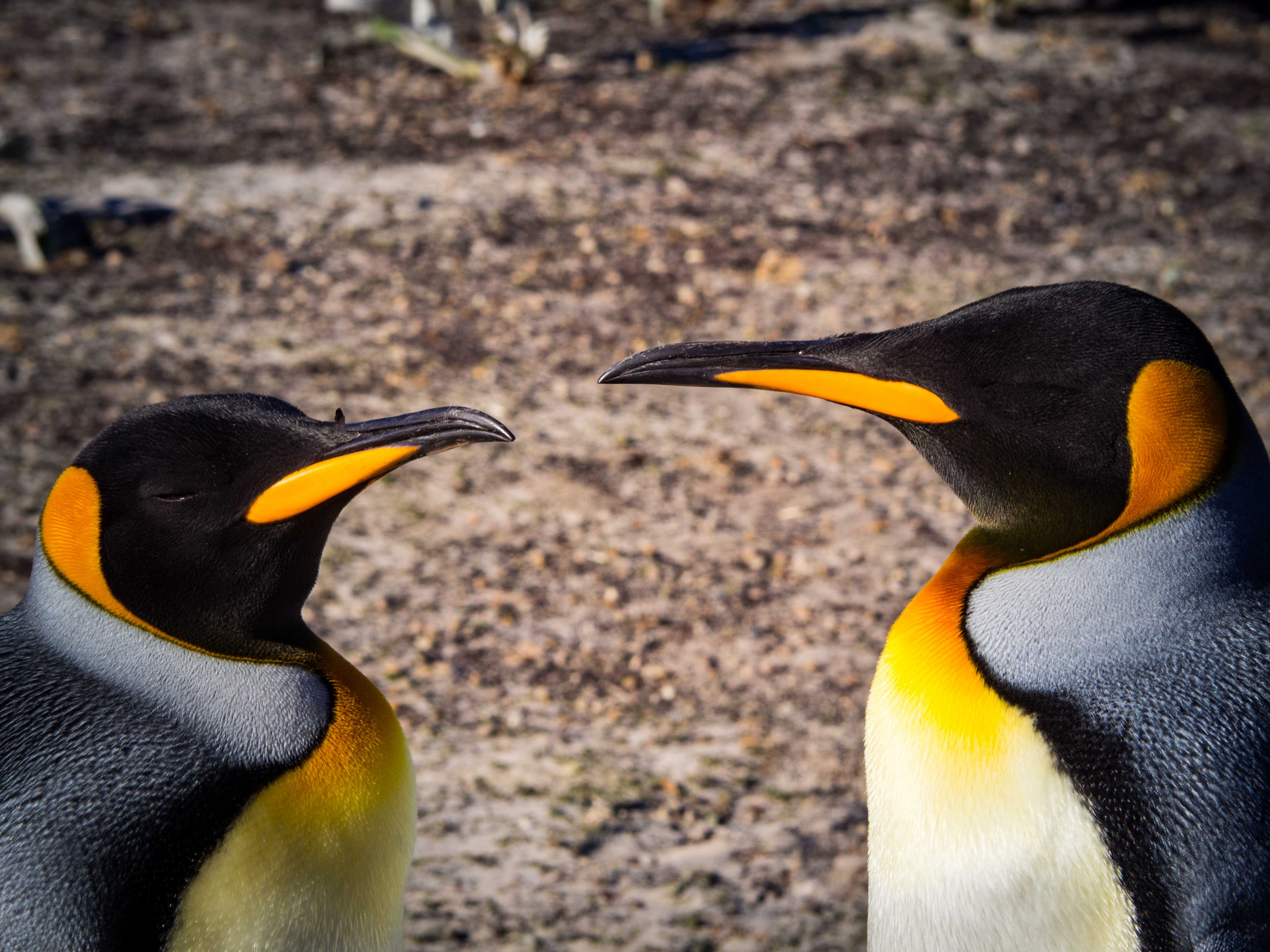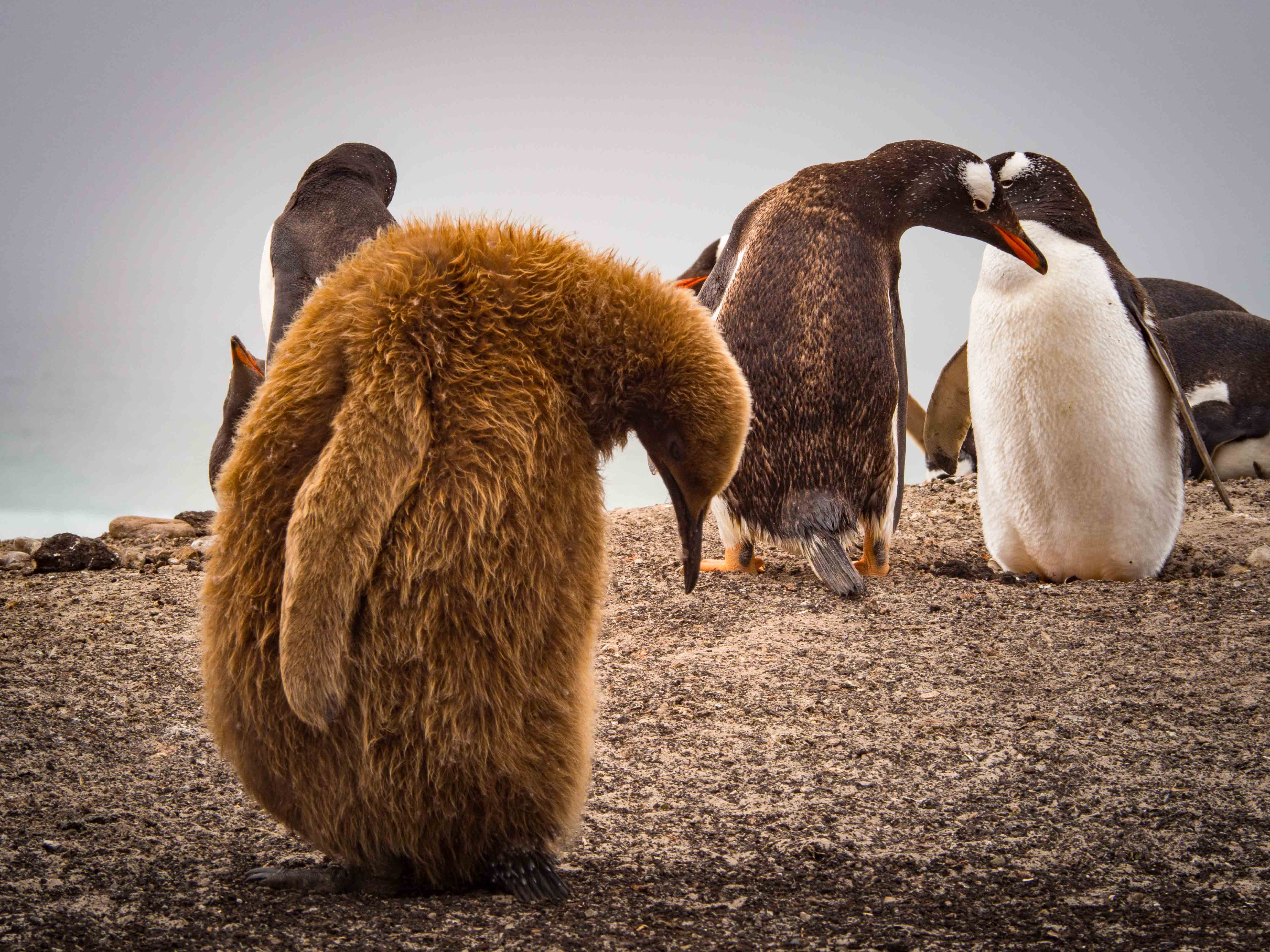 W końcu opamiętujemy się i zmierzamy w głąb wyspy, w kierunku przeciwległego wybrzeża. Napotykamy niewielką grupkę pingwinów królewskich. Jeśli dosłownie przed chwilą staliśmy w zachwycie, nie wiem jak nazwać stan w którym teraz jesteśmy. Jest w pingwinach królewskich coś dostojnego, hipnotyzującego, że ciężko oderwać od nich wzrok. Wśród stada widzimy 3 młode pingwiny, z których jeden jest jeszcze upierzony w całości na brązowo i nie przypomina w żaden sposób swoich rodziców.