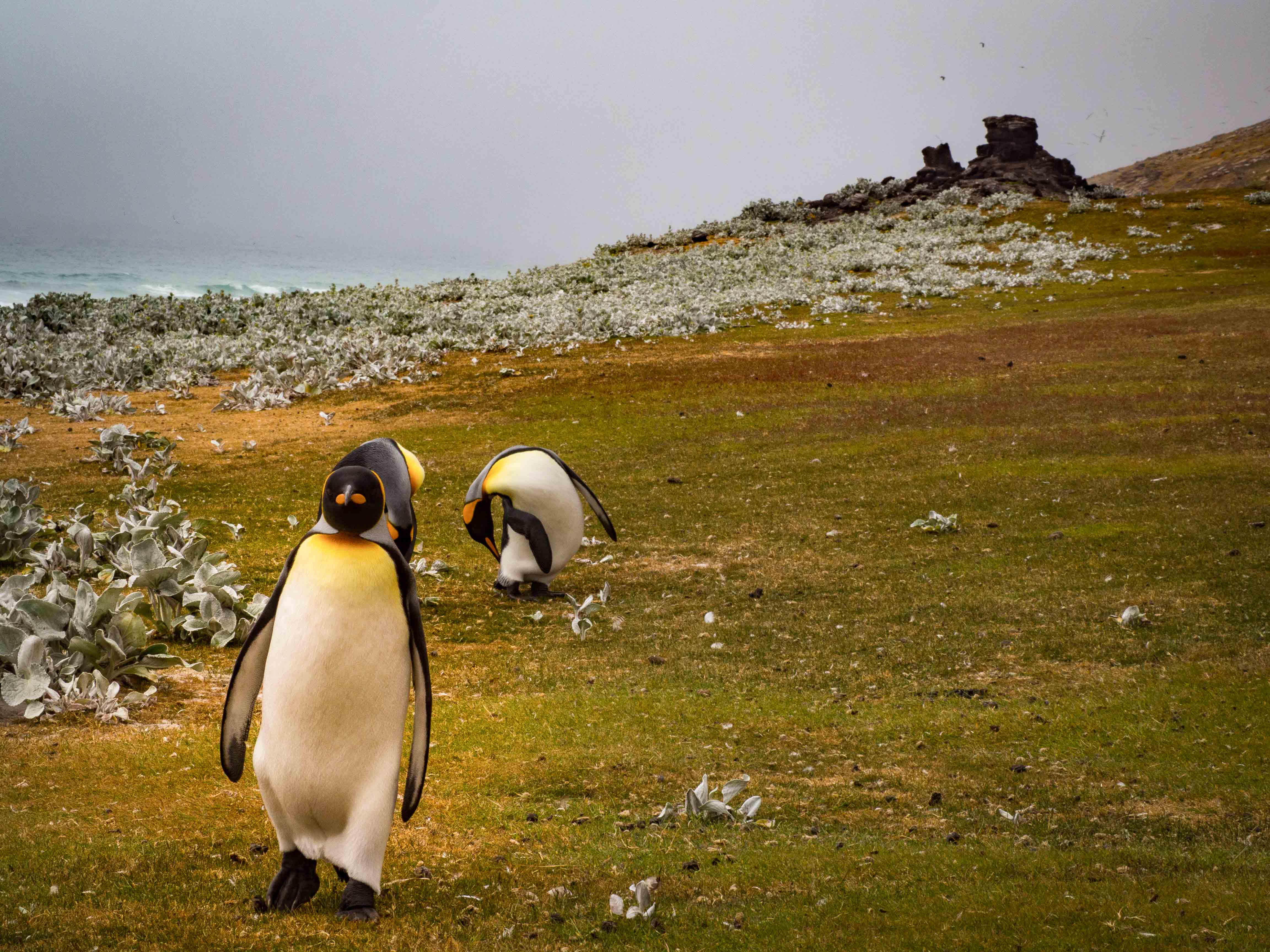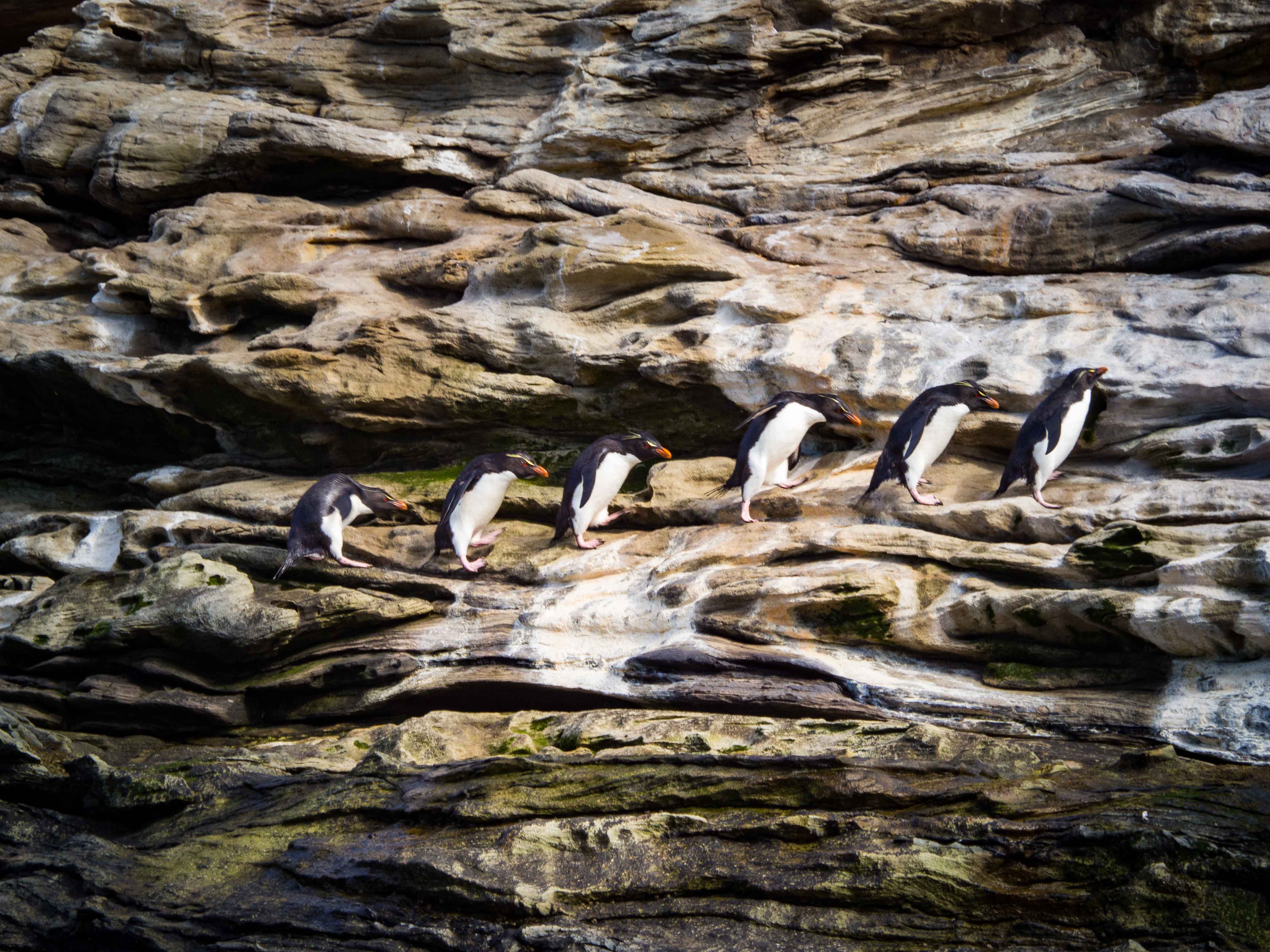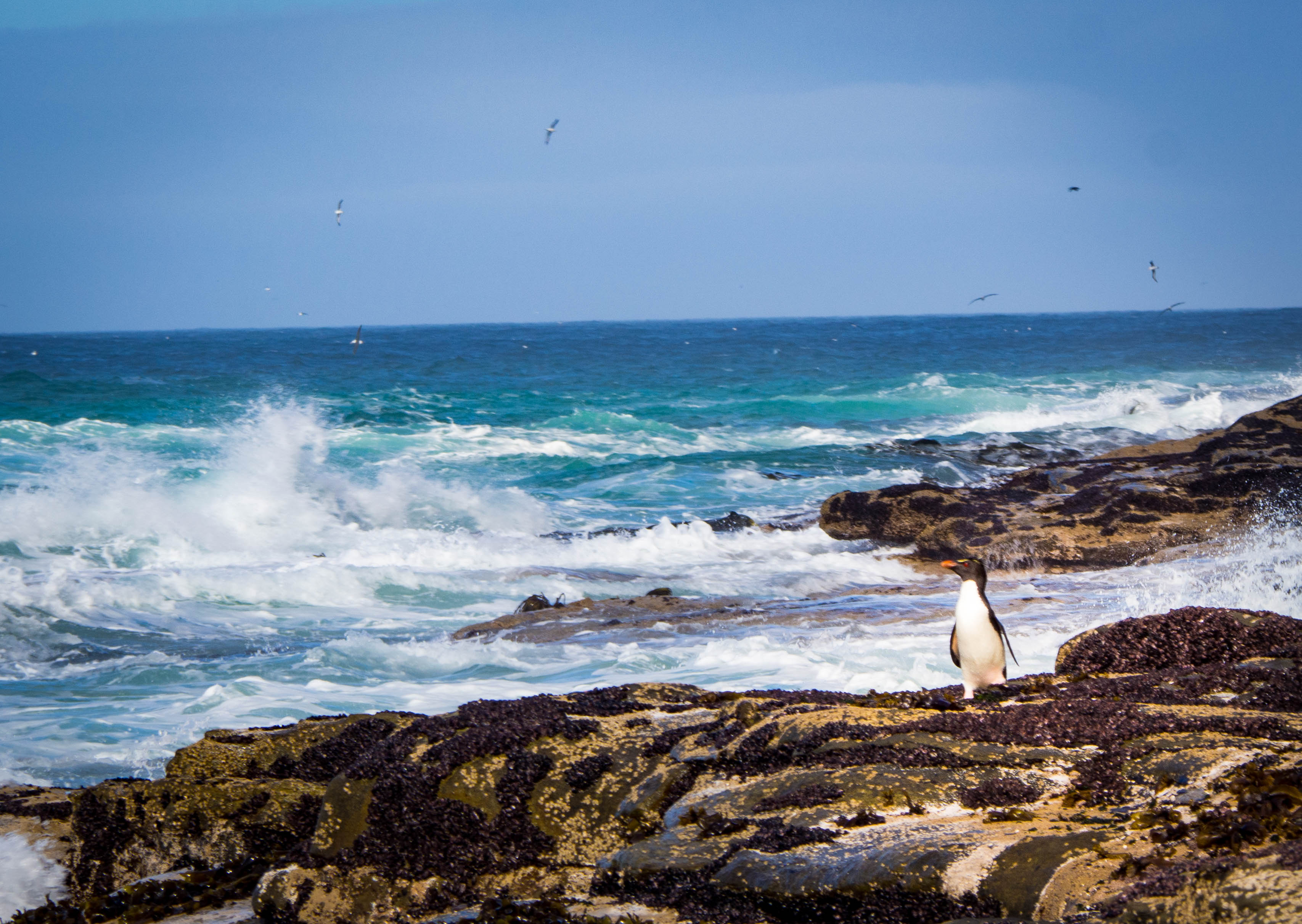 Pogoda zaczyna się poprawiać w samą porę, docieramy do klifu, a naszym oczom ukazuje się piękny widok plaży po której biegają przedstawiciele wszystkich 4 gatunków pingwinów. Trzeba przyznać, że pingwiny skalne mają gust, by wybrać swoje siedlisko w takim właśnie punkcie.