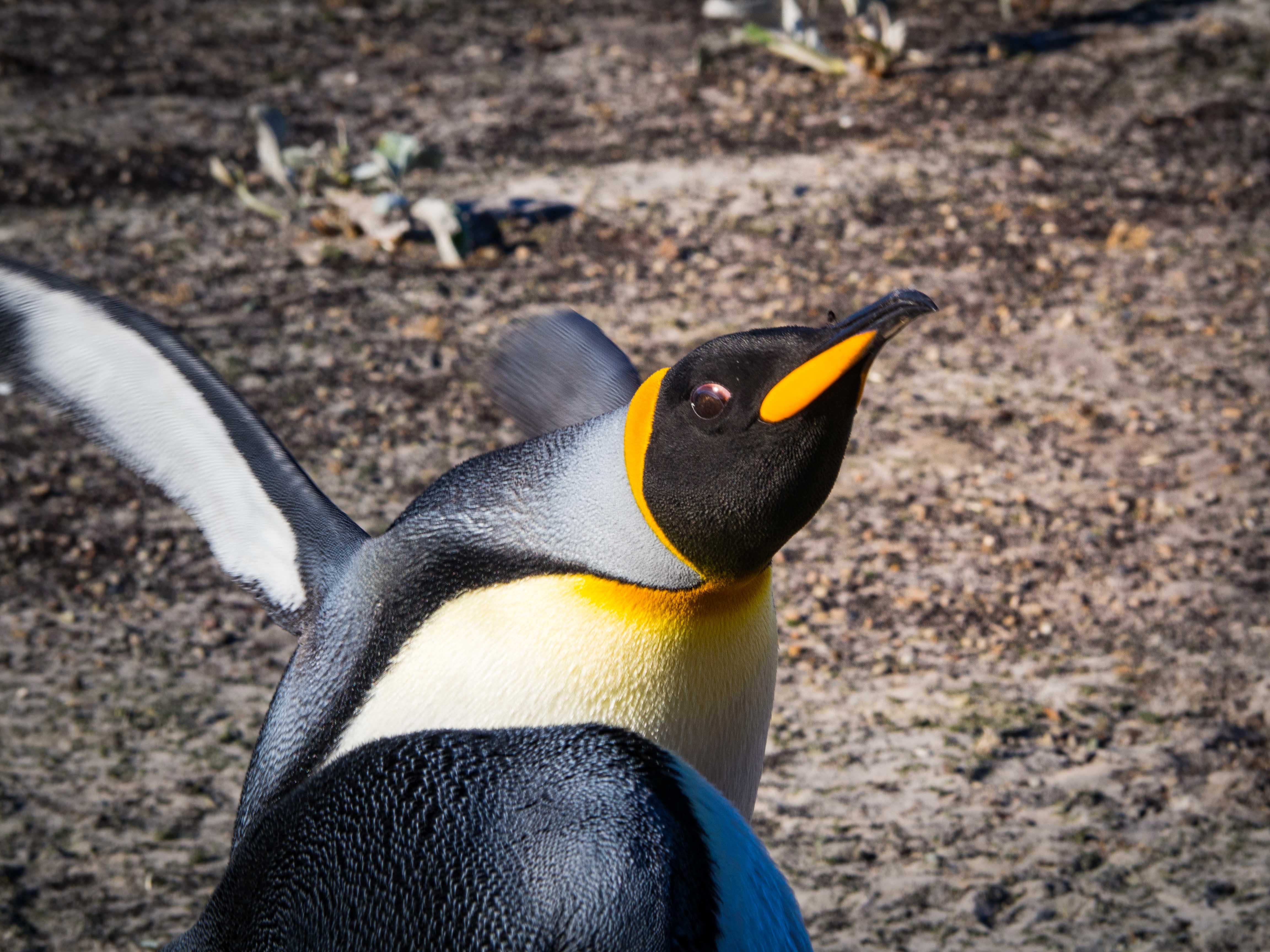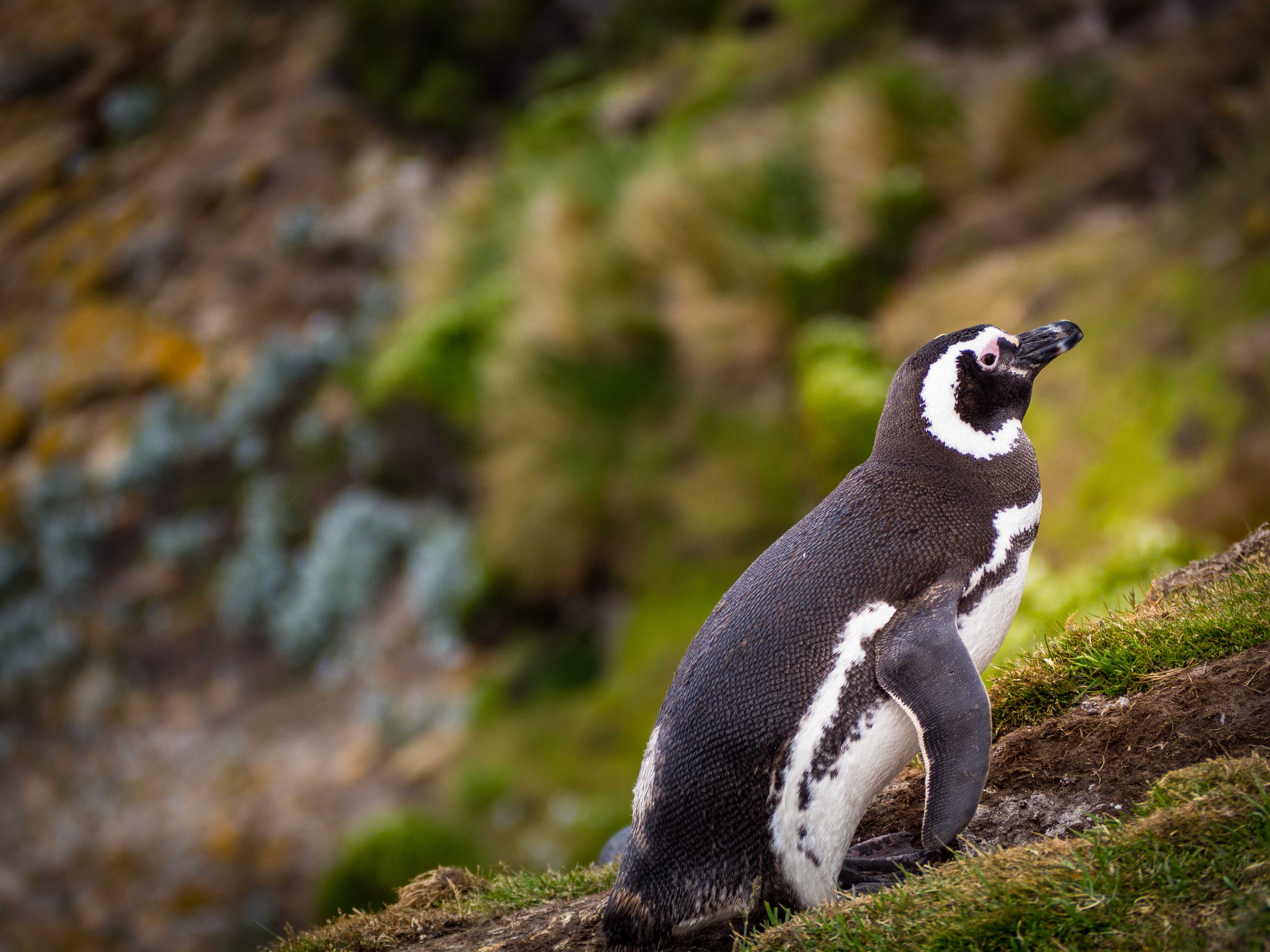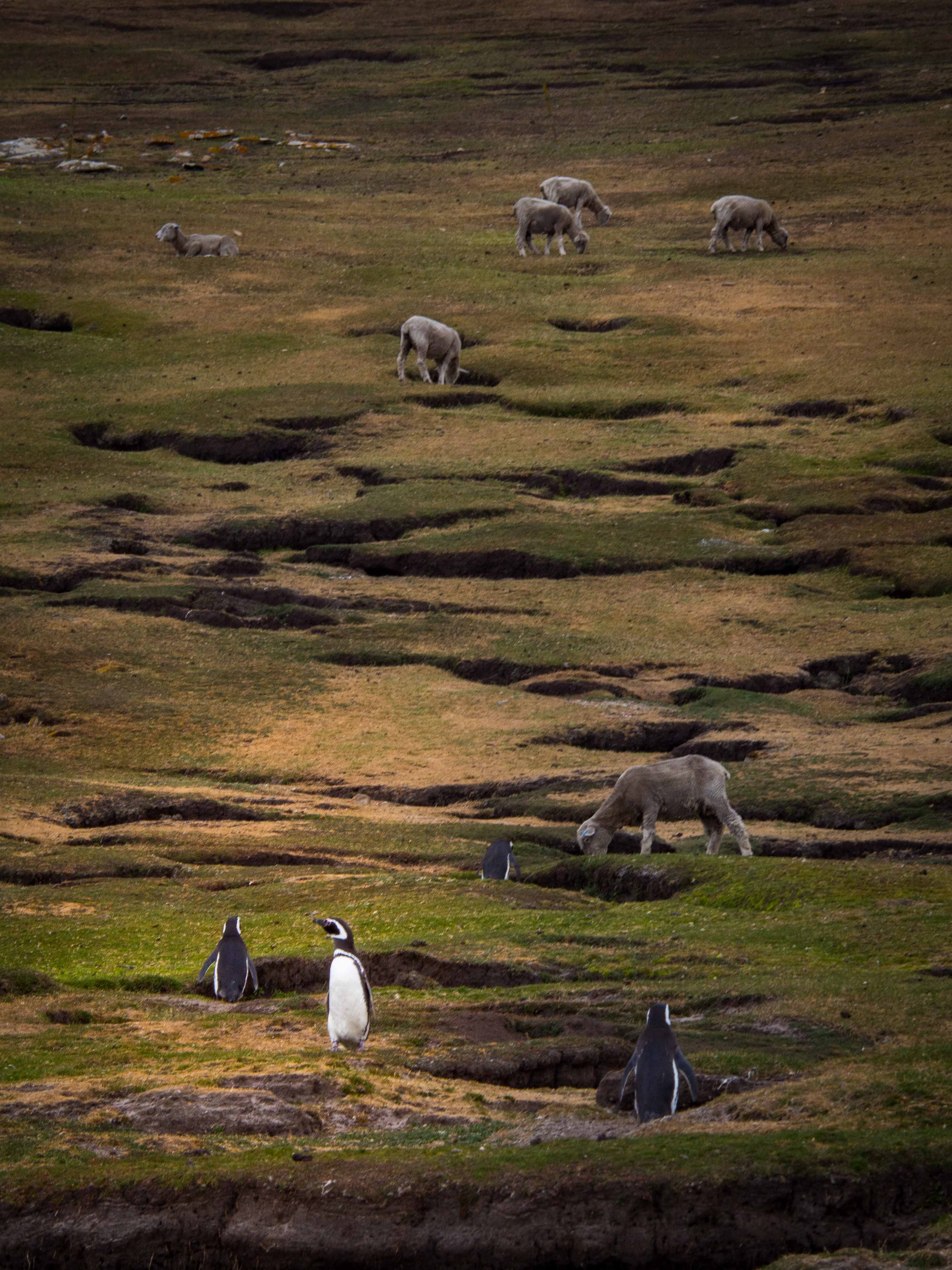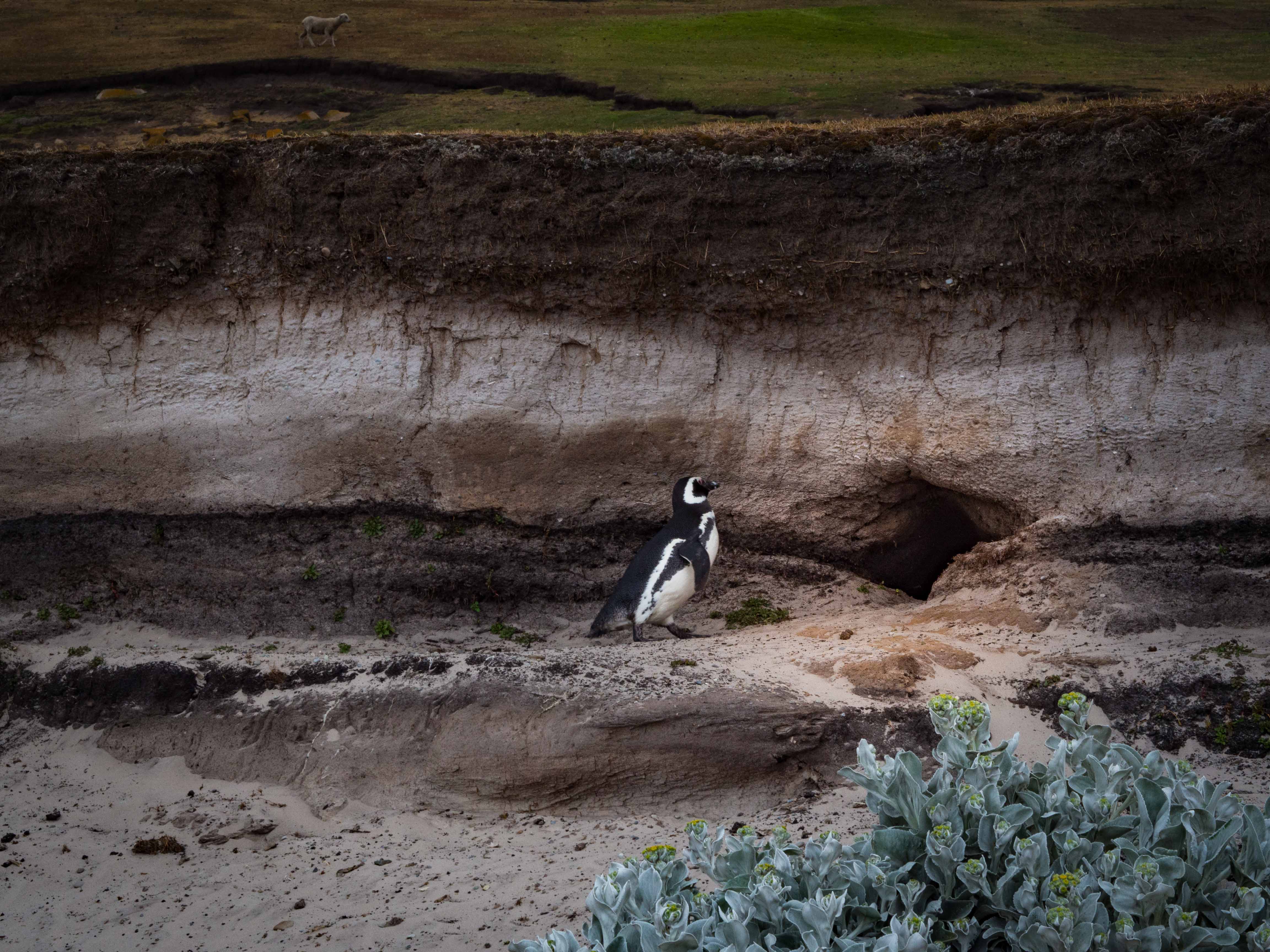 Moglibyśmy siedzieć i patrzeć na pingwiny królewskie godzinami, jednak trzeba ruszać dalej. Udajemy się do kolonii pingwinów skalnych, położonej na niedalekim klifie. Nim tam jednak docieramy napotykamy znane nam skądinąd pingwiny magellańskie tuż przed ich nietypowymi norami wykopanymi na zboczu.
