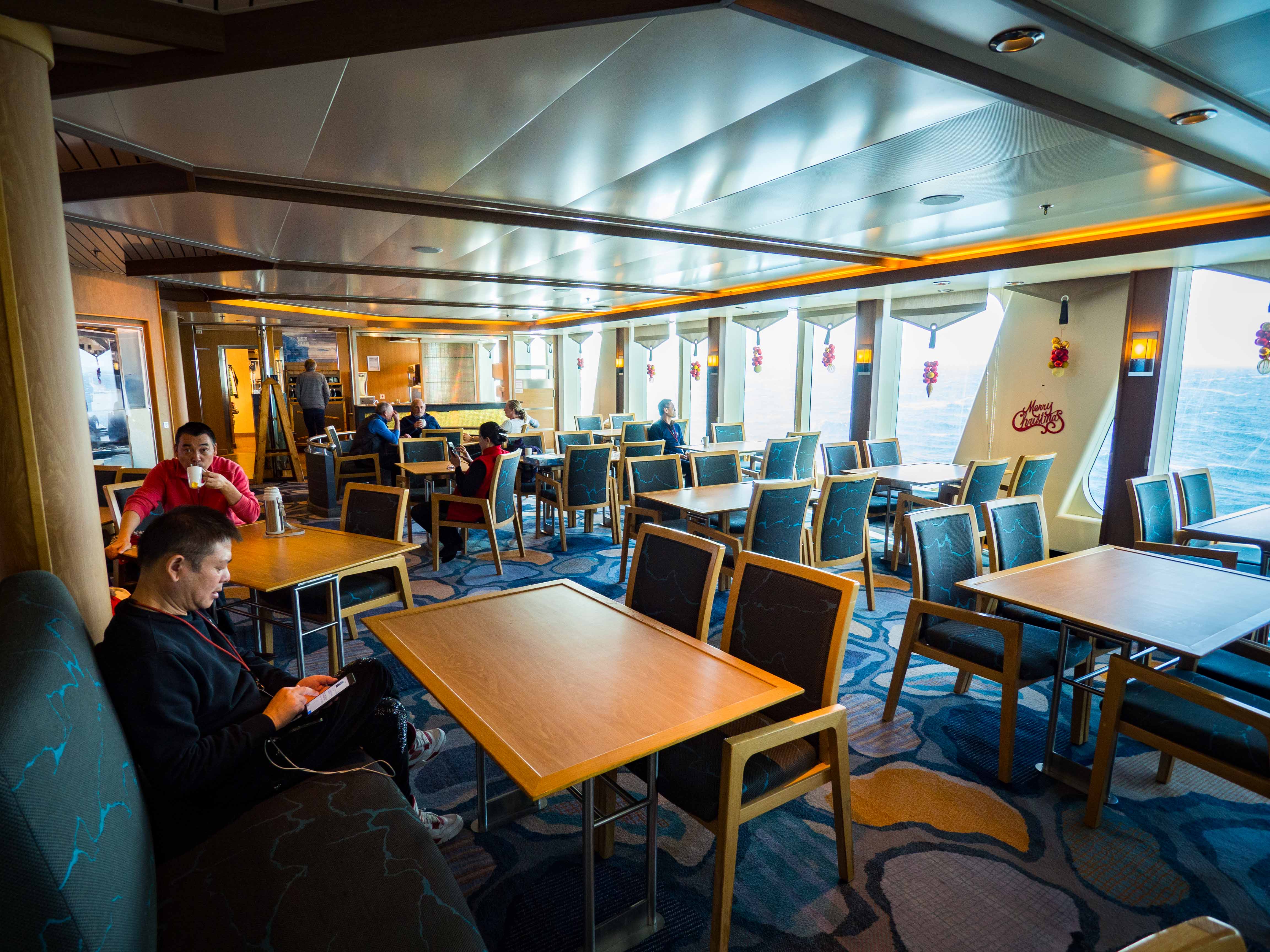 Jak się później dowiadujemy wśród pasażerów dominują Chińczycy (47 osób) oraz Brytyjczycy (41), Niemcy, Francuzi i Amerykanie (po 30+ osób). Innych Polaków brak. Jesteśmy najmłodsi na pokładzie, znacząco zaniżając średnią wieku, która najpewniej plasuje się około sześćdziesiątki. Z ulgą odkrywamy, że jest jeszcze 5 osób w wieku 30+, z którymi przyjdzie nam się obracać już do końca rejsu.