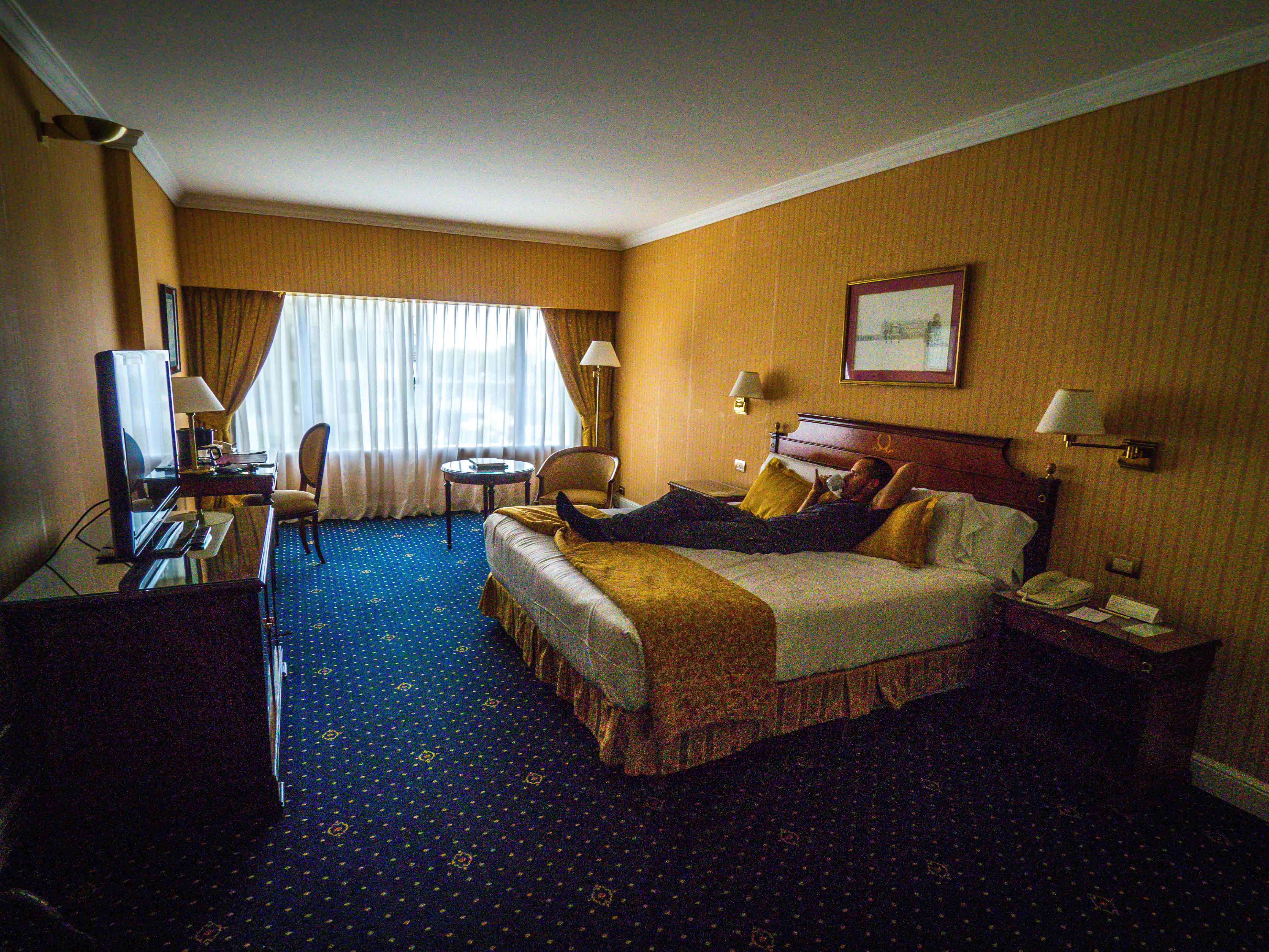Dokonujemy krótkiego rozpoznania w kabinie – do takich komfortowych warunków nawet nie zbliżyliśmy się w czasie dotychczasowej 3-miesięcznej podróży po Ameryce Południowej. Nie możemy jeszcze się rozpakować i cieszyć luksusem, pozostaje jedna kwestia do załatwienia – kupno coca-coli do przemyconych na pokład wyskokowych trunków.