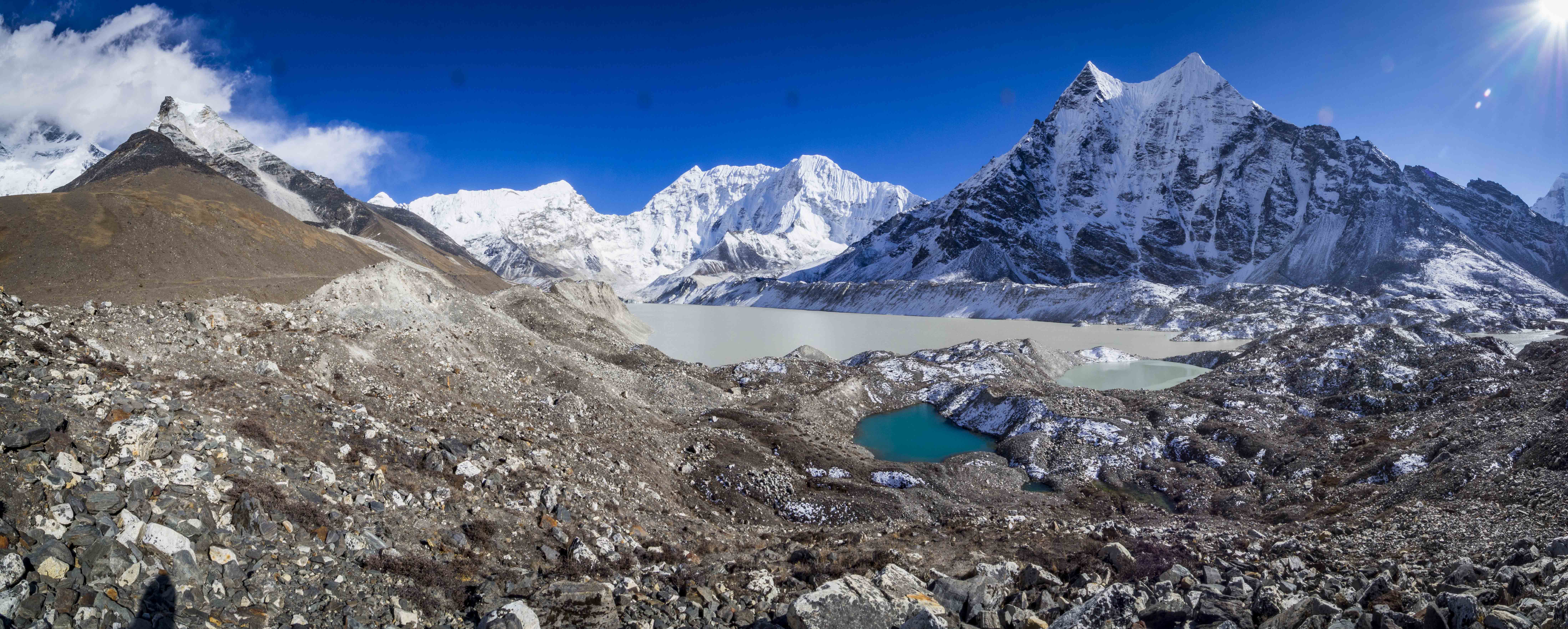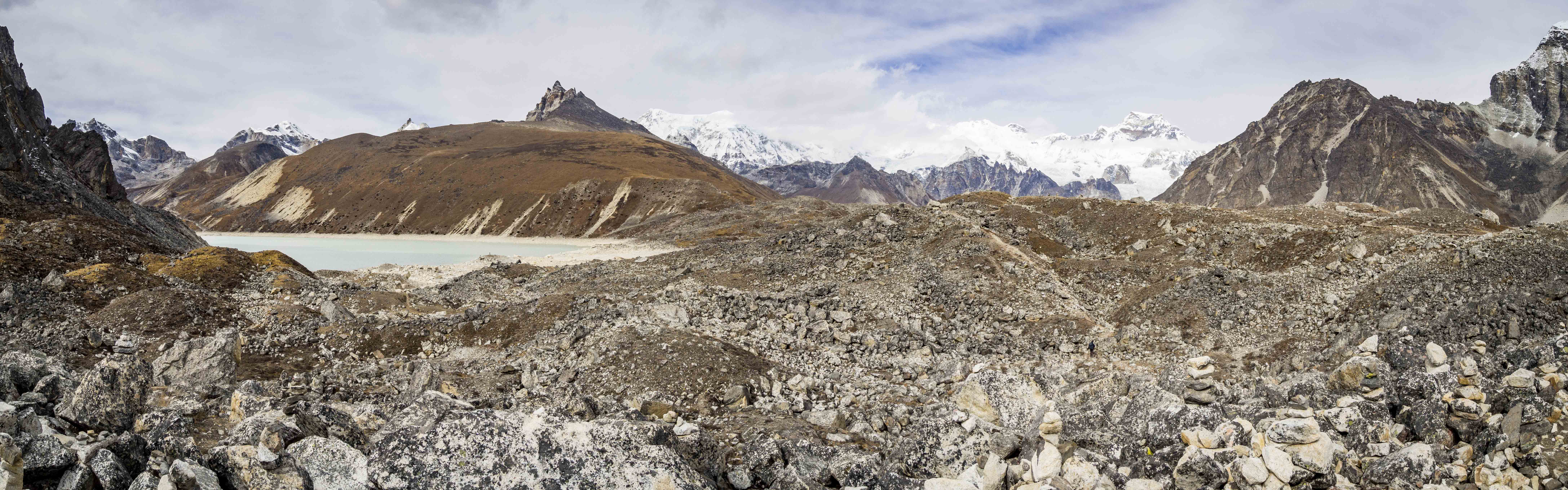 Po krótkiej przerwie w lodży ponownie ruszamy na szlak. Zmieniamy w locie nasze wcześniejsze plany, wbrew założeniom nie wchodzimy na Gokyo Ri – już o 11 nad górską panoramę zaczynają nachodzić ciemne chmury. W to miejsce udajemy się na przechadzkę do “jezior Gokyo”. Dochodzimy do czwartego z jezior (Donag Tsho) i na tym poprzestajemy, kolor jezior jest typowo lodowcowy, co na pewno nie zachęca by kontynuować wędrówkę szarą moreną (zwłaszcza, że piąte jezioro znajduje się kolejne 4 km dalej).