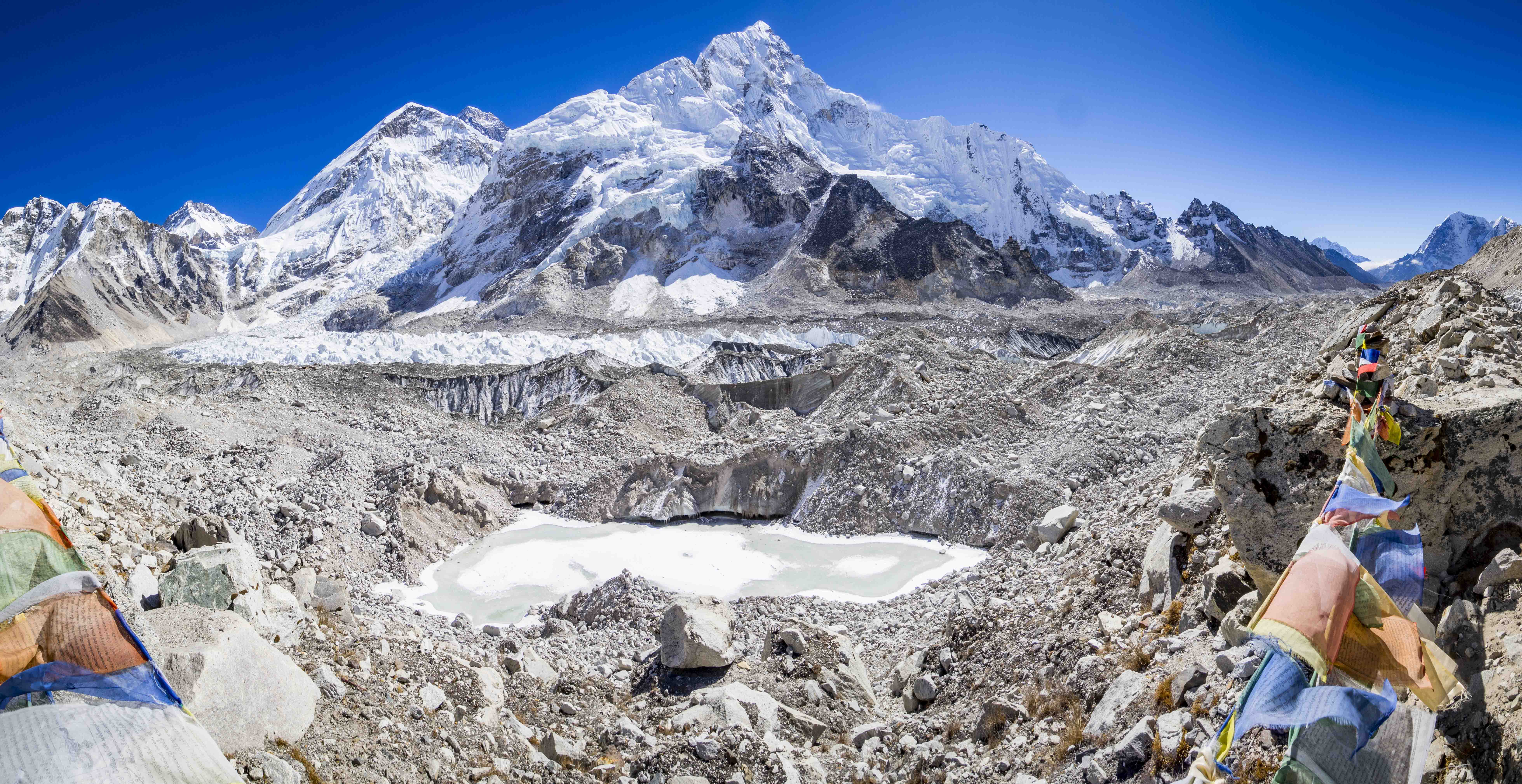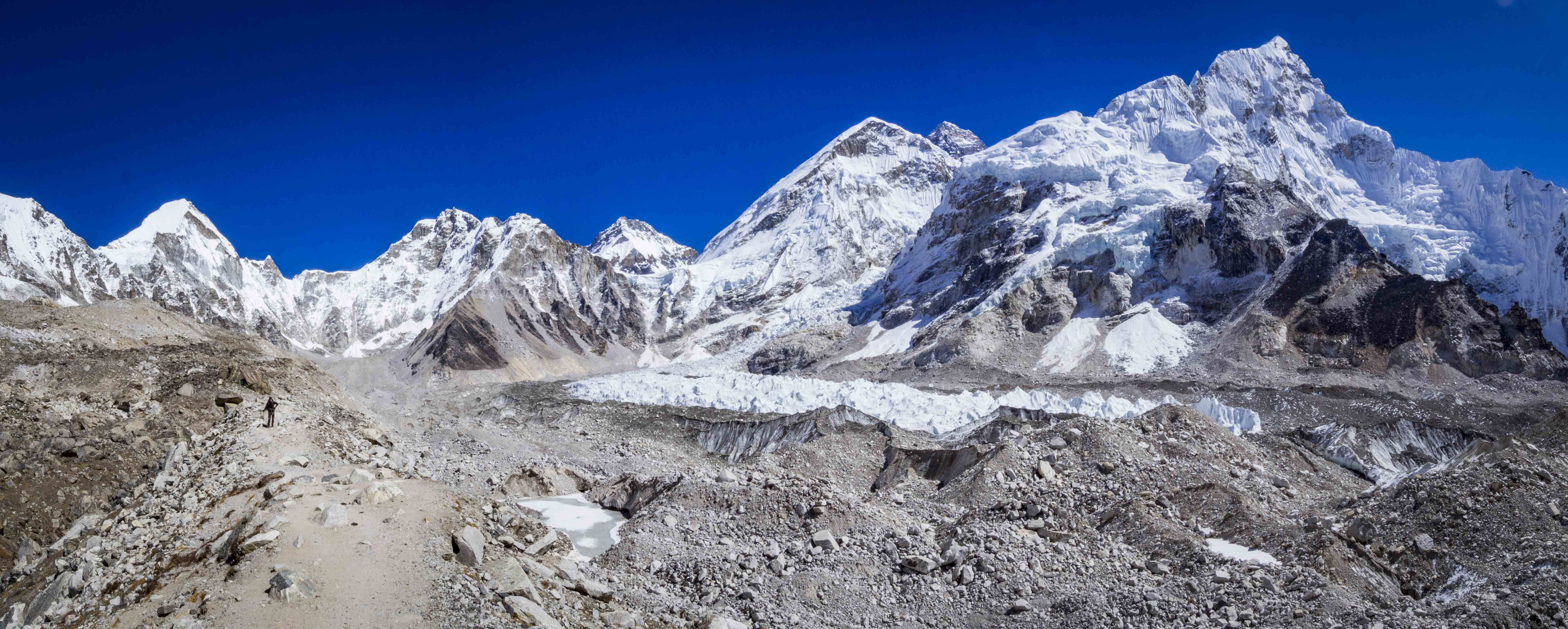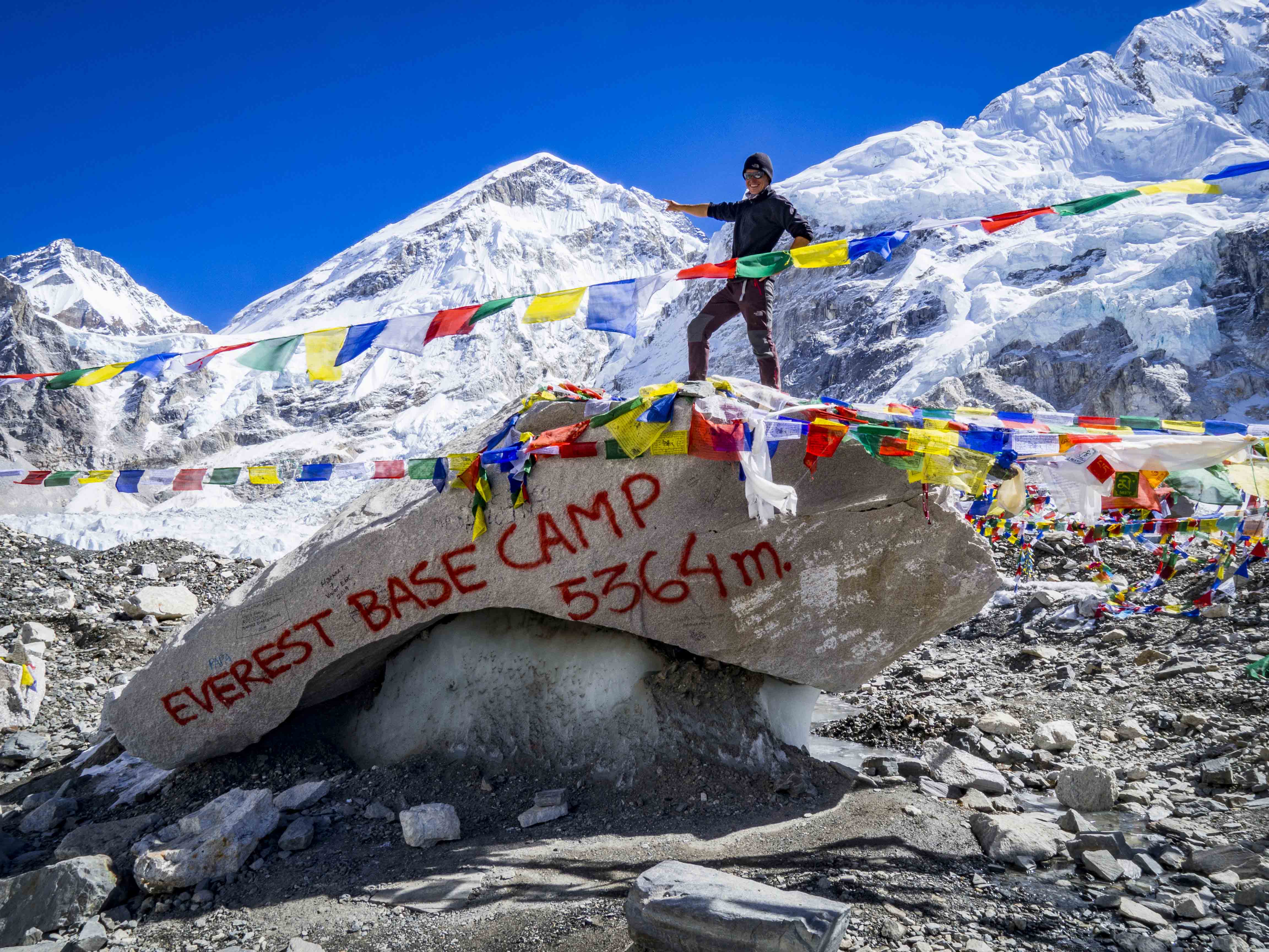 Z Gorak Shep do base campu wiedzie 3-kilometrowa, dość żmudna droga zboczem kamienistej moreny. Co rusz zejście w dół, podejście do góry, nasze uda powoli nie domagają. W końcu dochodzimy do base campu, w tym momencie pustego. Wspinacze zbierają się tu w kwietniu i maju, czekając na kilku-, kilkunastodniowe okno pogodowe na wejście na szczyt. Pomijając brak namiotów, zupełnie inaczej wyobrażaliśmy sobie to miejsce. Base camp jest położony właśnie na wspomnianej kamienistej i nierównej morenie, tuż przy ogromnym lodowcu Khumbu. Zdjęcia EBC, które znamy przedstawiają to miejsce w bardziej “przytulnym” świetle. By nie wprowadzić nikogo w błąd… Everest to ten mały kikutek, na który wskazuję palcem na jednej z fotek. 😀 Ta piękna góra z przodu to Nuptse.