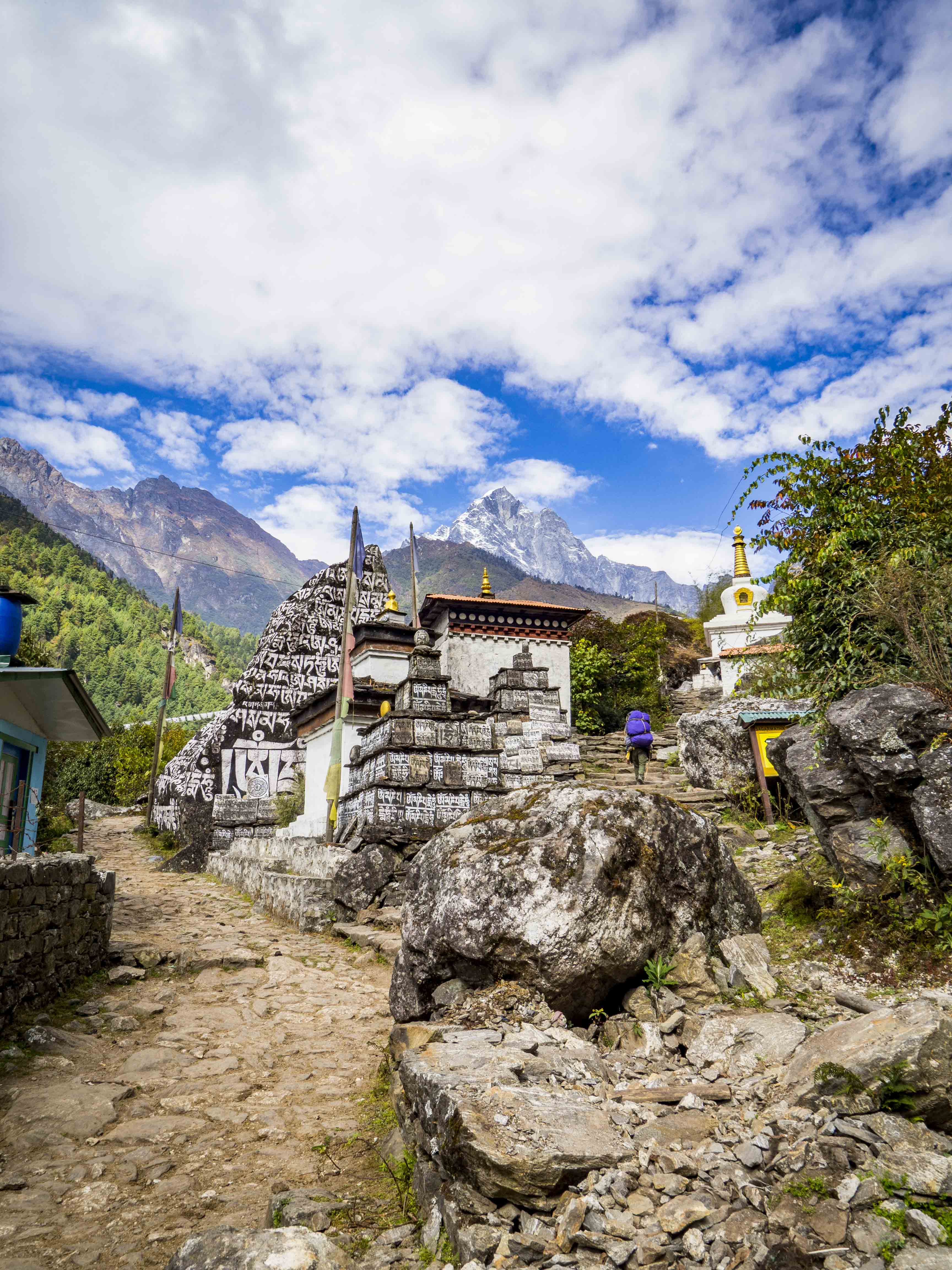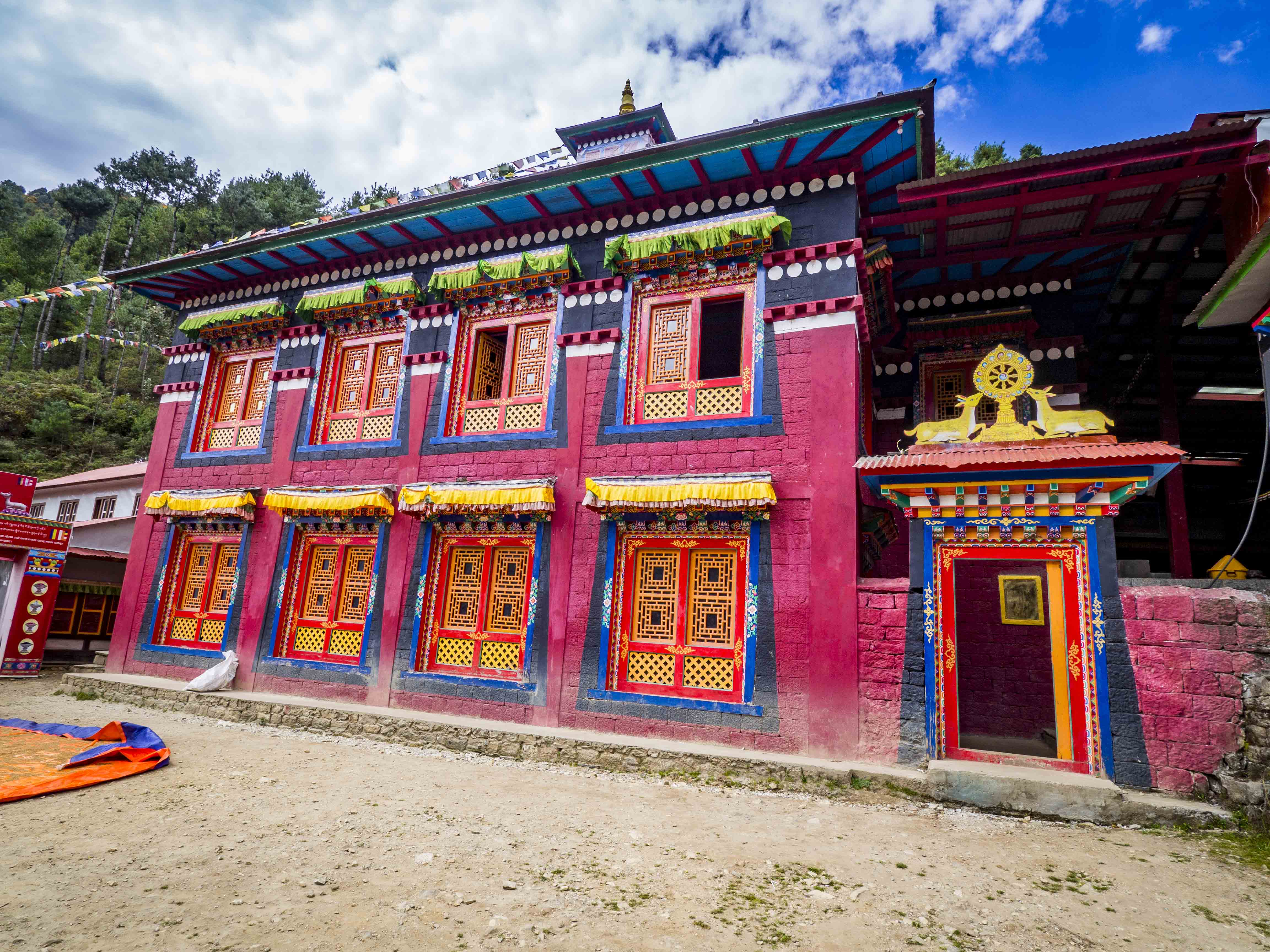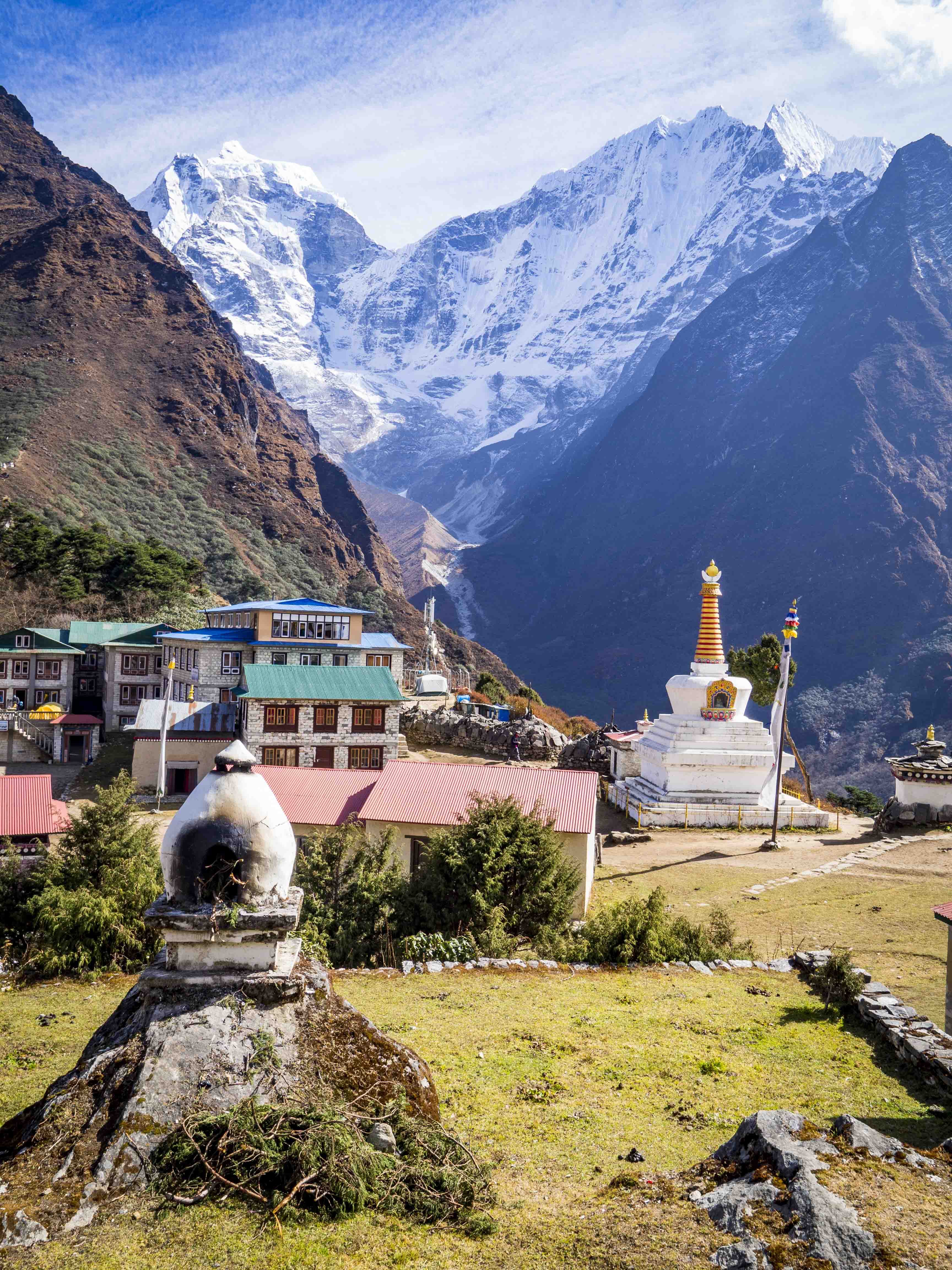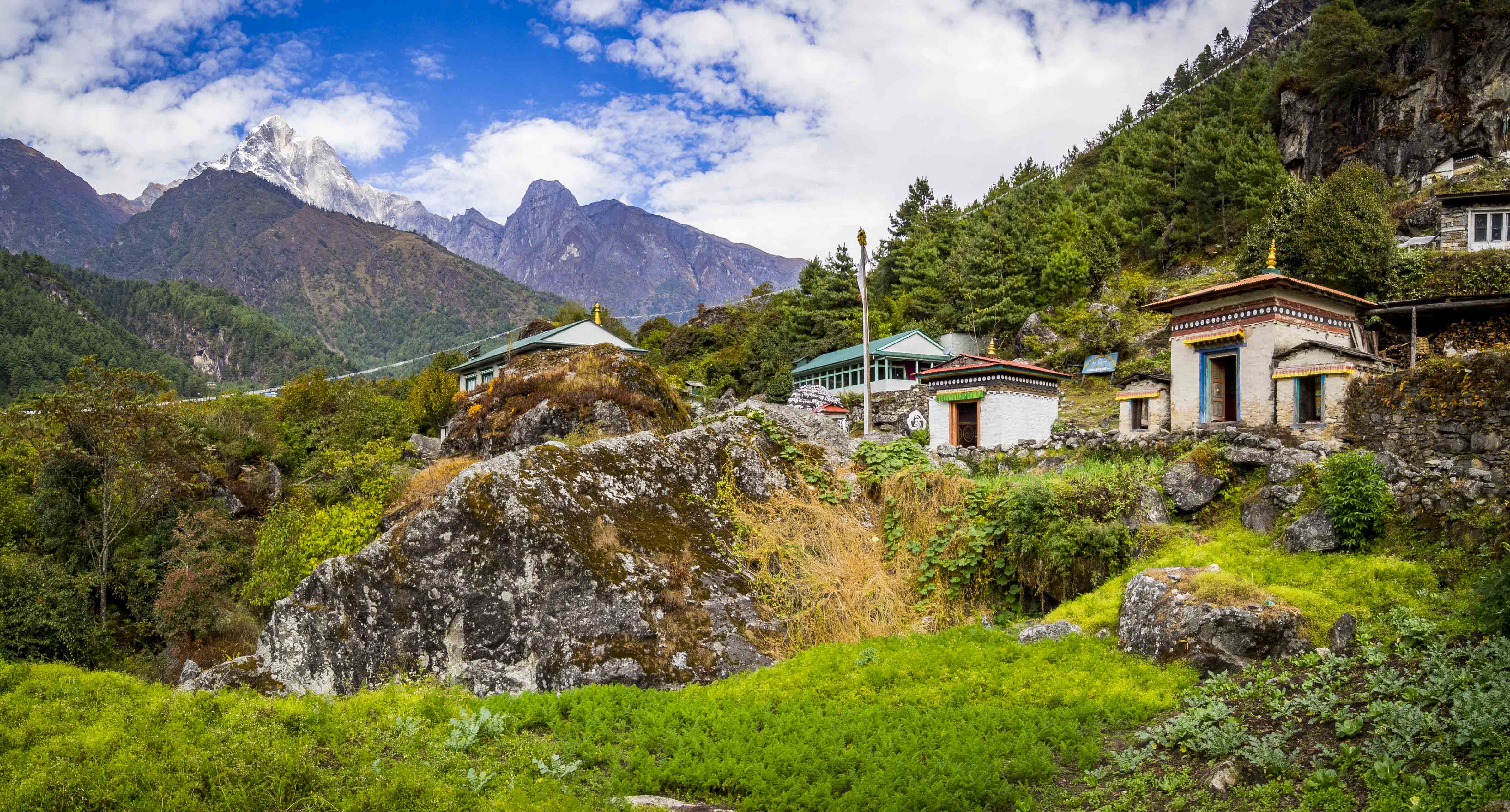 Odbieramy nasze plecaki z wózeczka gościa rozładowującego nasz samolot i szczęśliwi o 7.40 ruszamy wreszcie z trekkingiem. Ku naszemu zaskoczeniu już na samym początku na horyzoncie pojawiają się pierwsze, ośnieżone sześciotysięczniki. U dołu dominuje jednak “letnia” atmosfera, dość mocno przypieka słońce, wokół pełno zieleni. W połowie drogi, tuż za osadą Phakding decydujemy się na mały detour do najstarszego klasztoru w okolicy – pochodzącego z ok. 1500 r. Pemacholing Monastery. Klasztor jak klasztor (na dodatek nie można cykać zdjęć w środku), ale panorama stąd całkiem ujdzie.