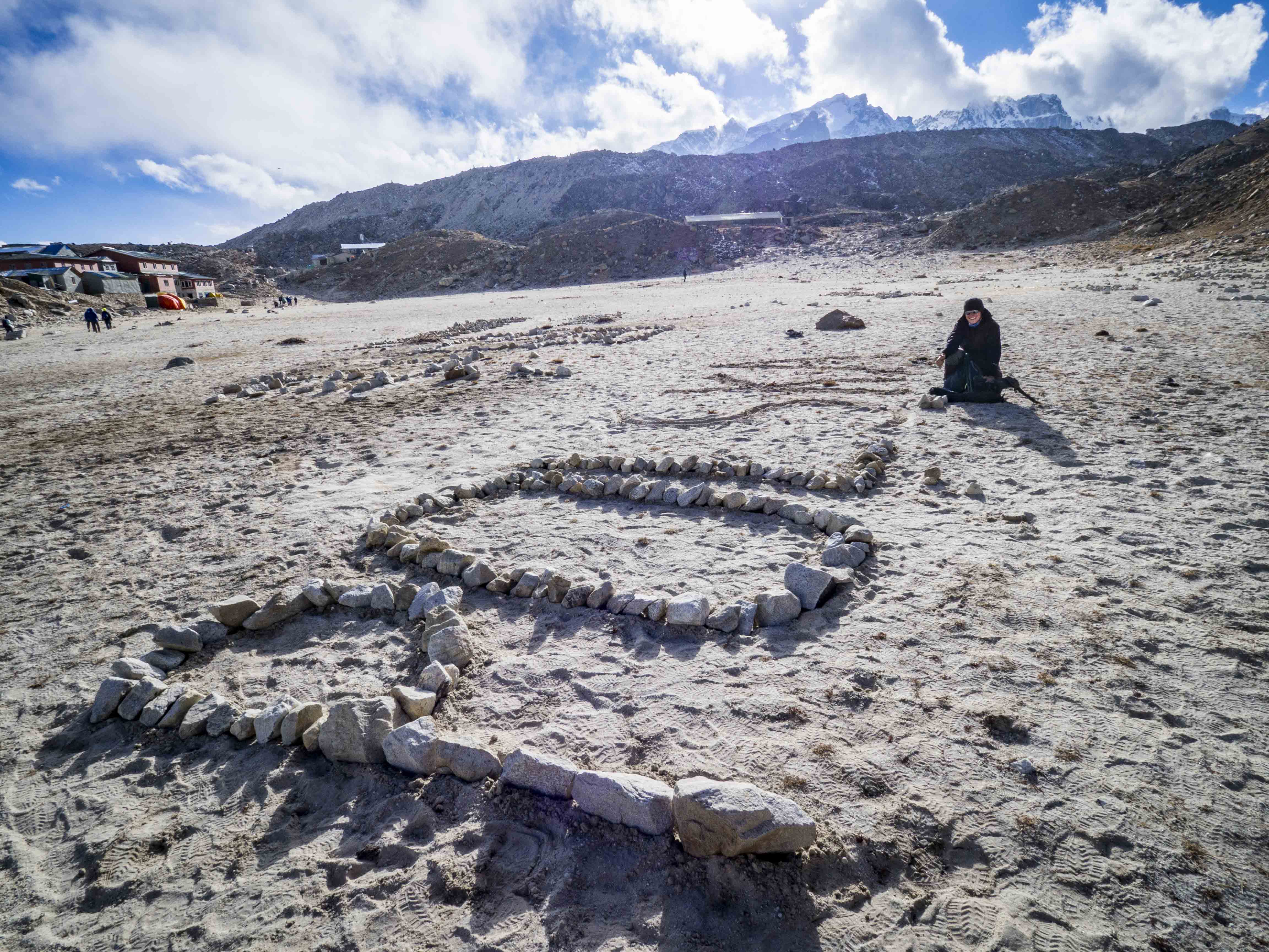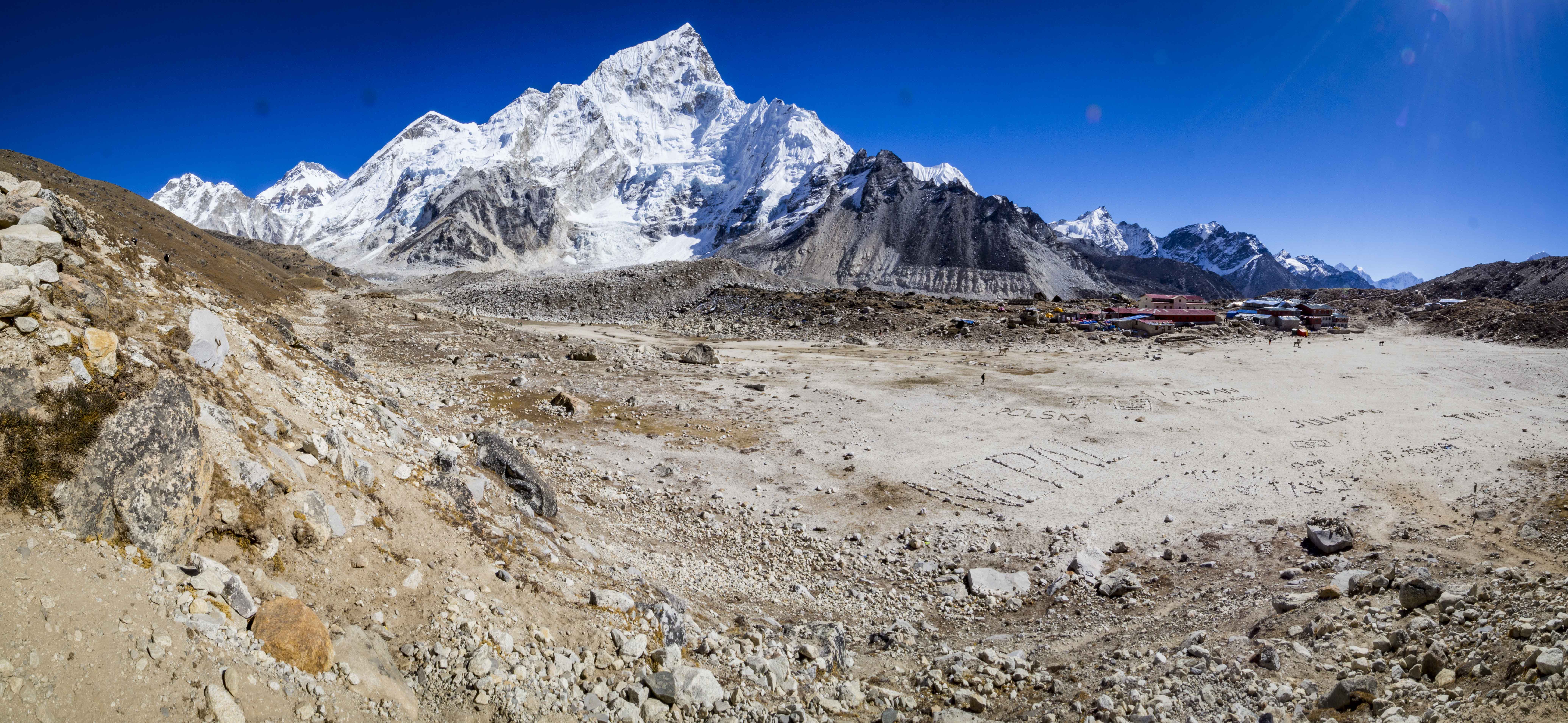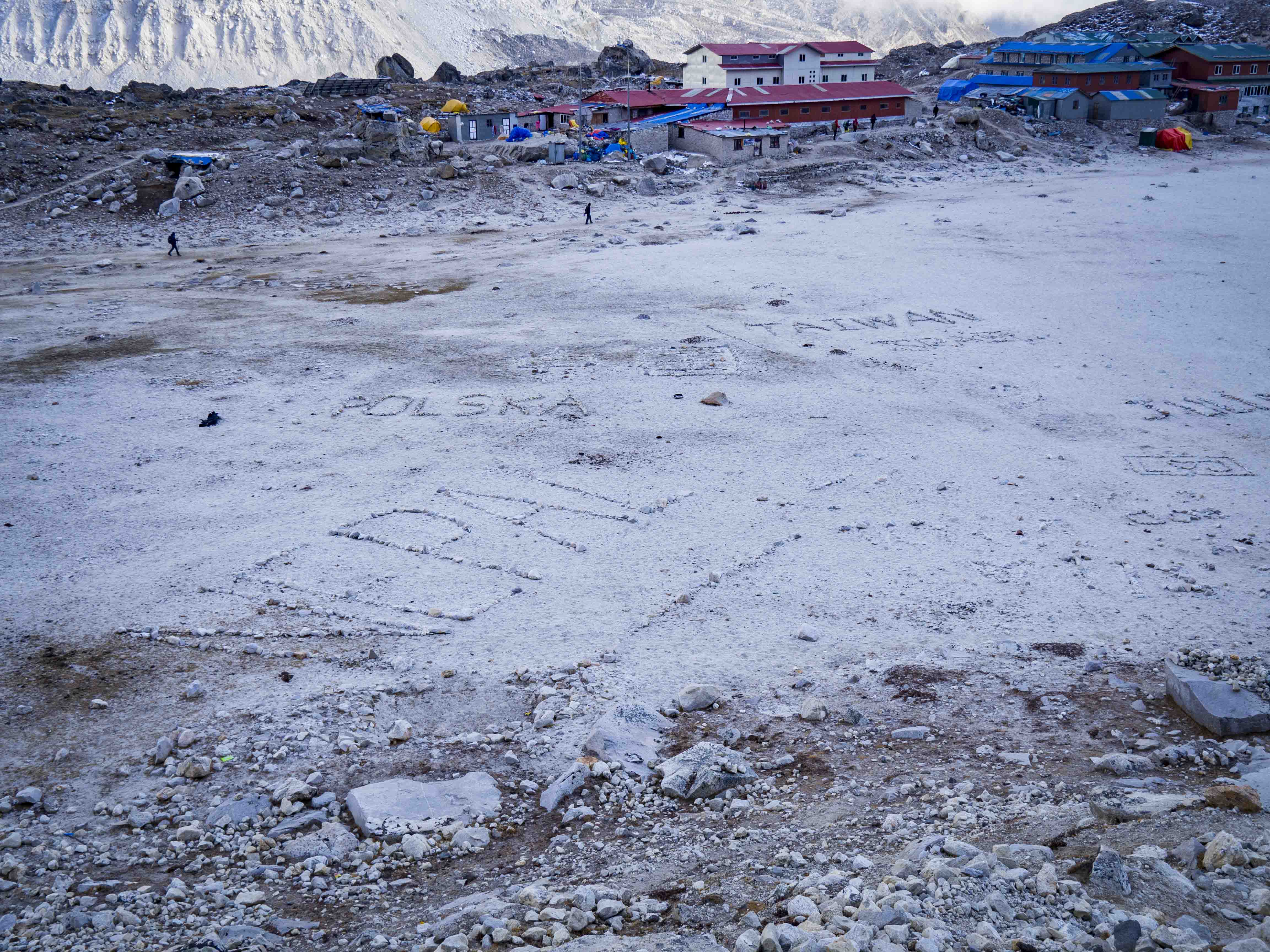 Dzisiejsze dobre tempo owocuje nadmiarem wolnego czasu, w lodży jesteśmy z powrotem już o 14. Odpowiedź na pytanie co dalej nie zajmuje nam długo… Pomiędzy wioską, a zejściem z Kala Pattar widnieje kilka napisów skonstrowanych z kamieni: Nepal, Tajwan, jakieś inne chińskie znaczki. Polacy są chyba najczęstszą nacją, którą spotykamy na codzień na drodze – dochodzimy więc do wniosku że to niemała żenada, że swojego napisu u podnóża Everestu nie posiadamy.