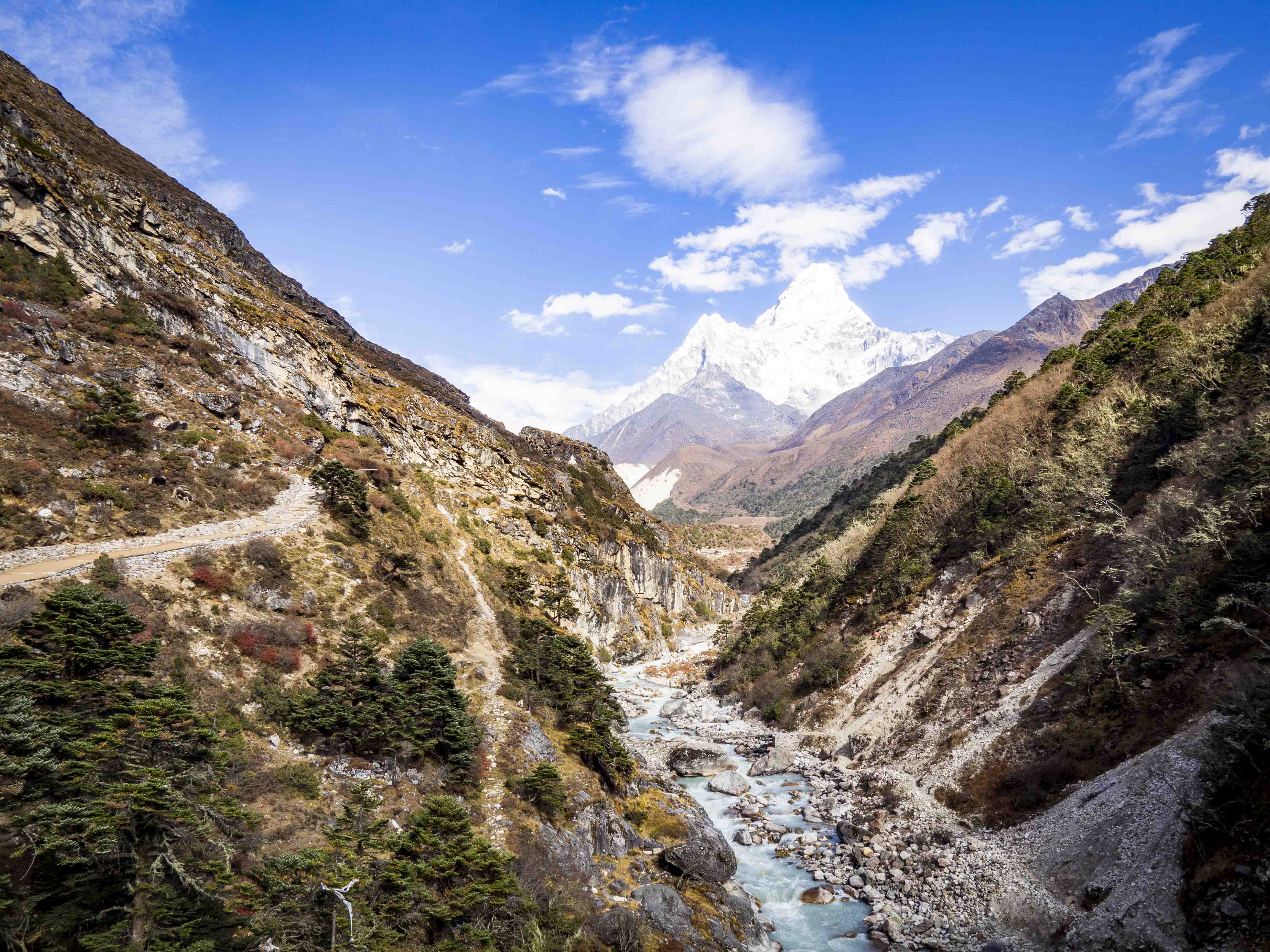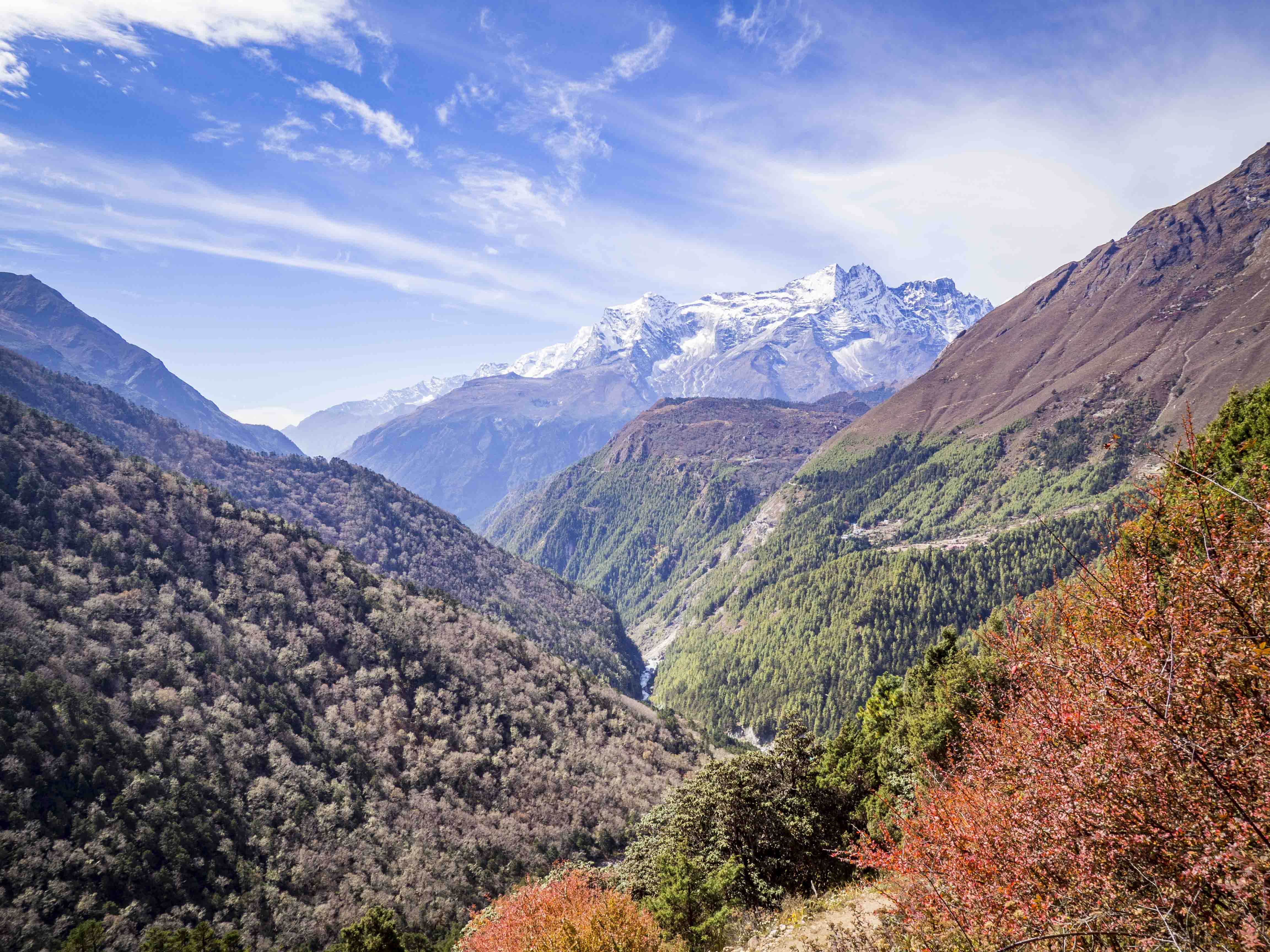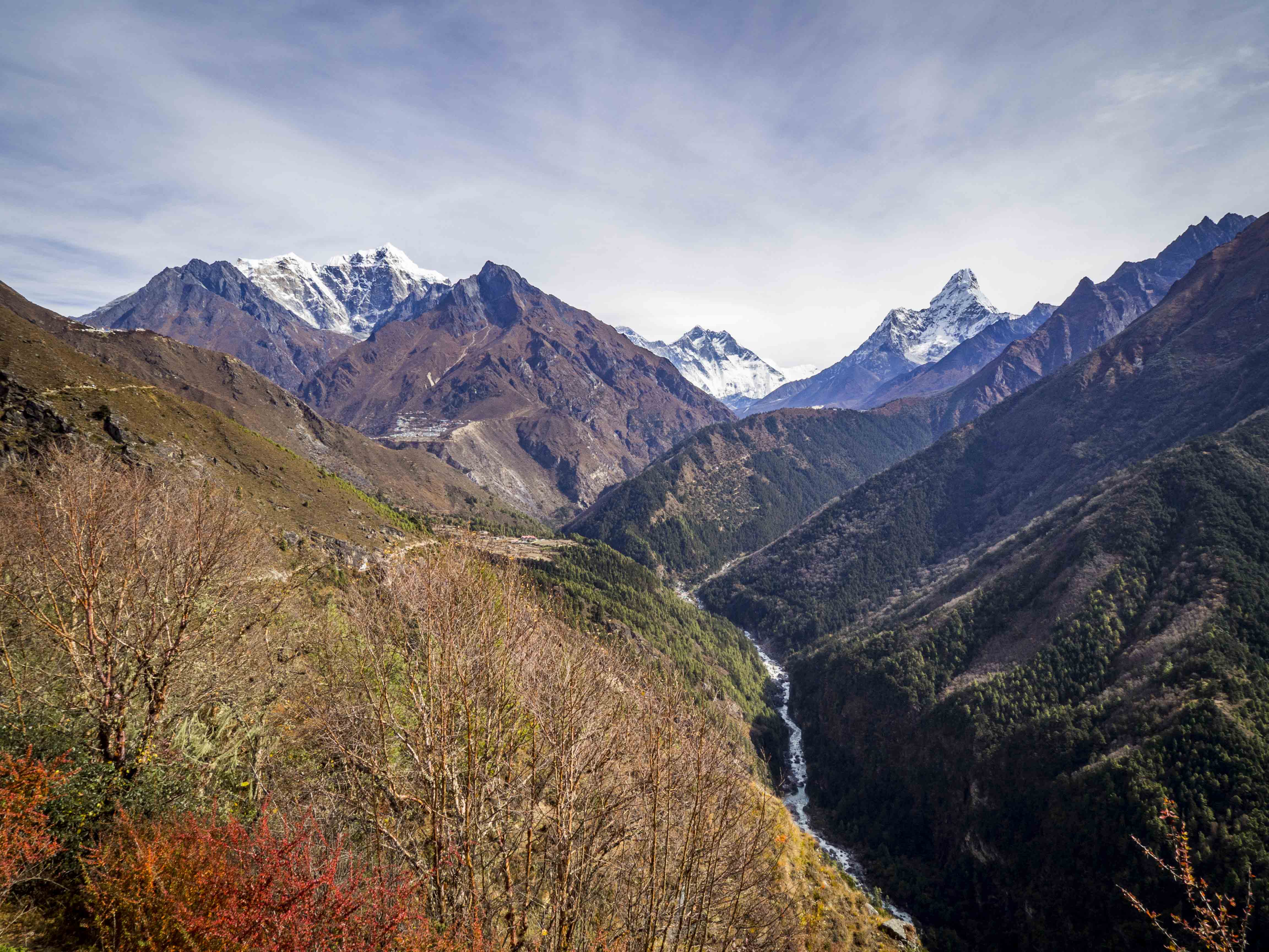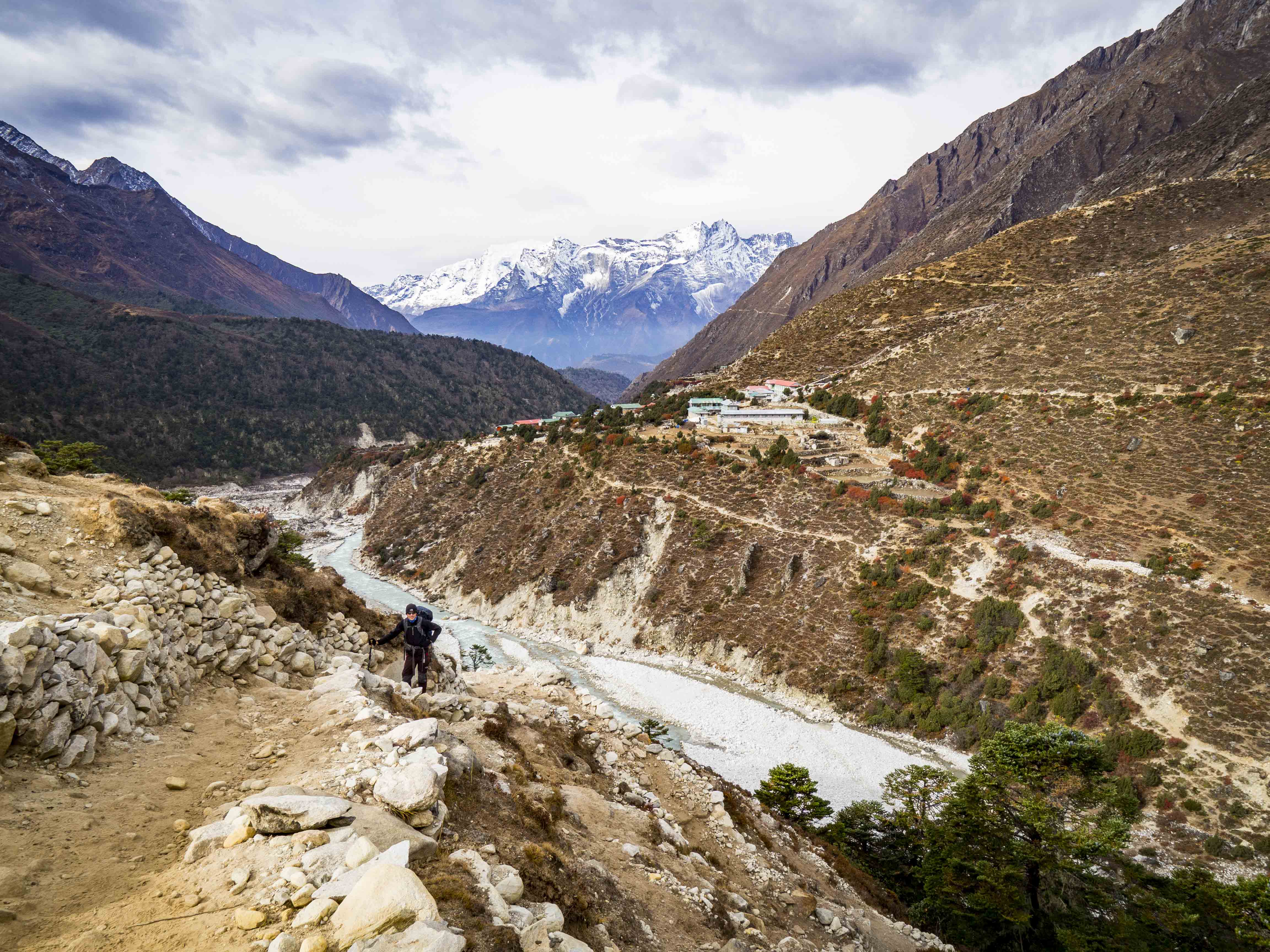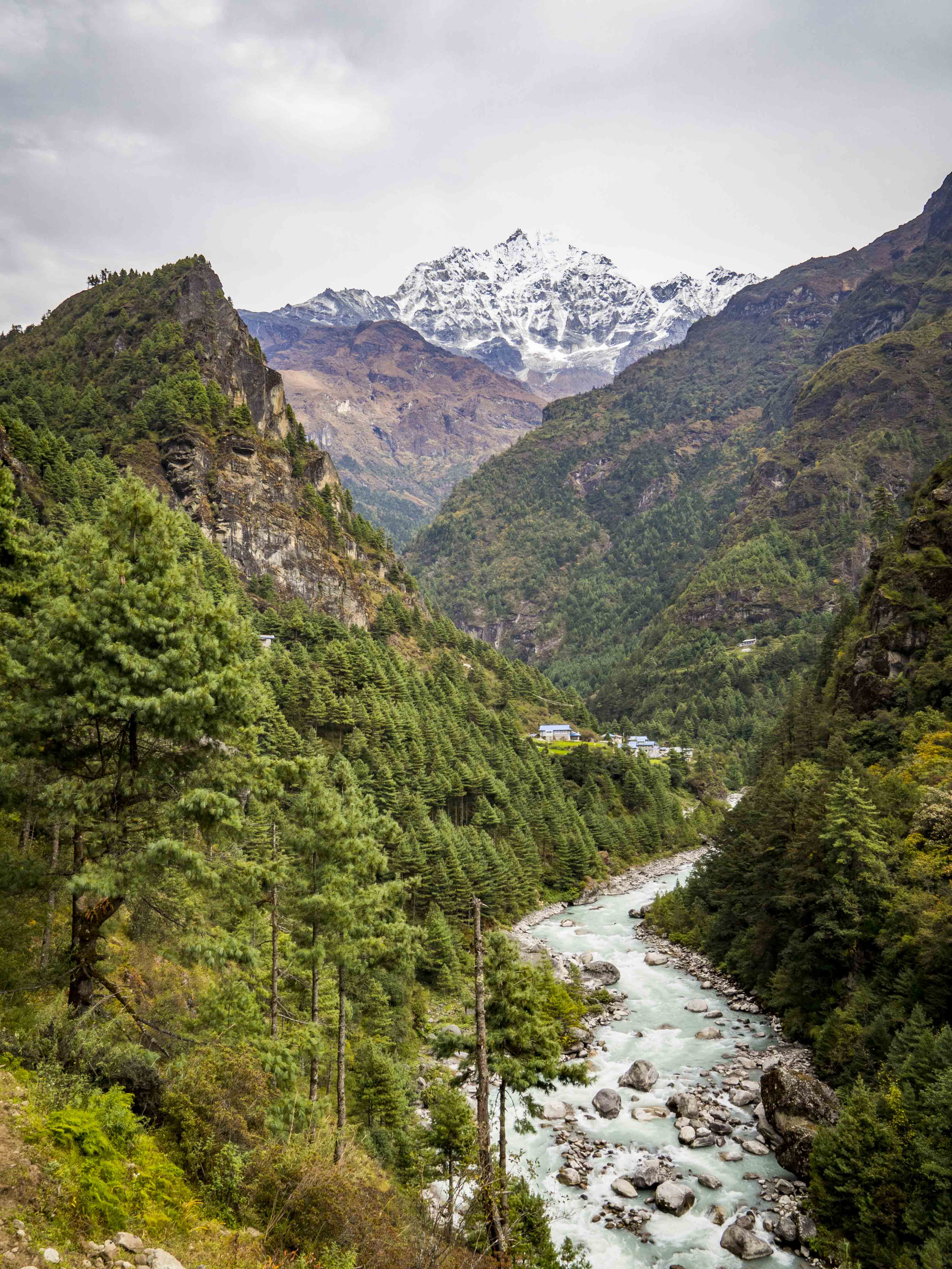 Całą drogę maszerujemy wzdłuż rzeki Bhote. Nadzieję w nasze serca wlewa widok Thamserku, który pnie się tuż przed naszym dzisiejszym celem – Namche Bazaar. Nadziei zostajemy pozbawieni, gdy za Thamo wkraczamy w gęsty las i nie mamy żadnego punktu odniesienia. To zdecydowanie najdłuższe kilometry tego treku, my chcemy już tam być!! 🙂