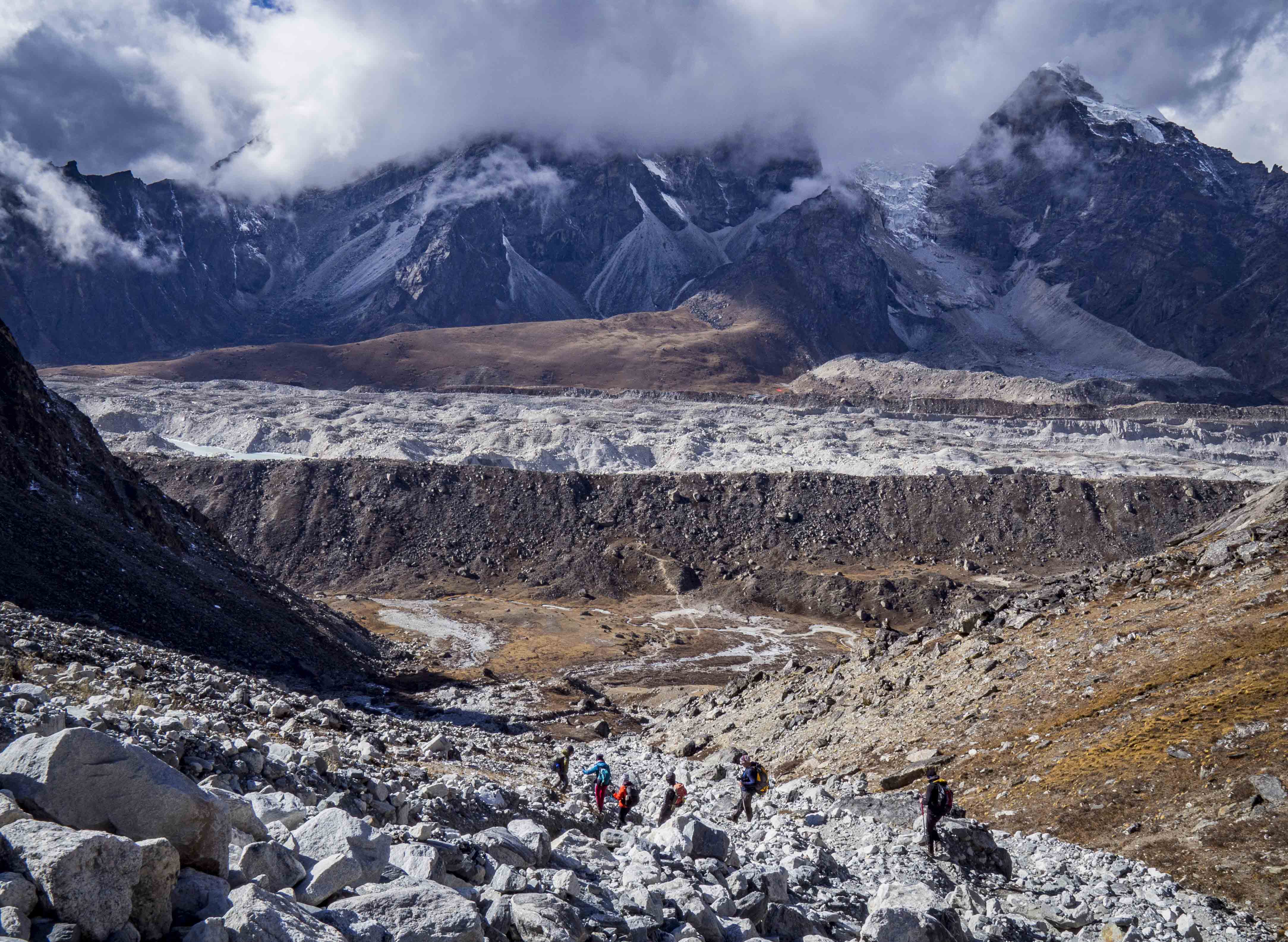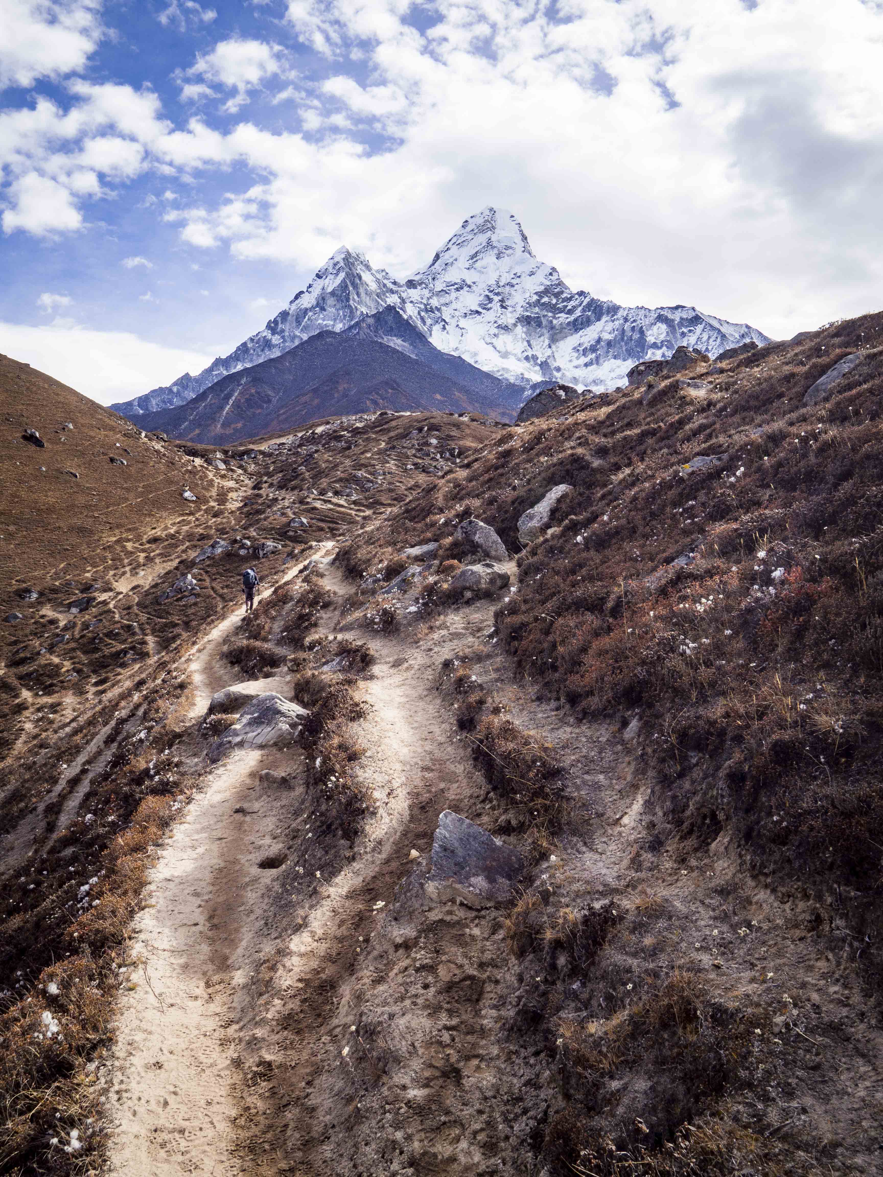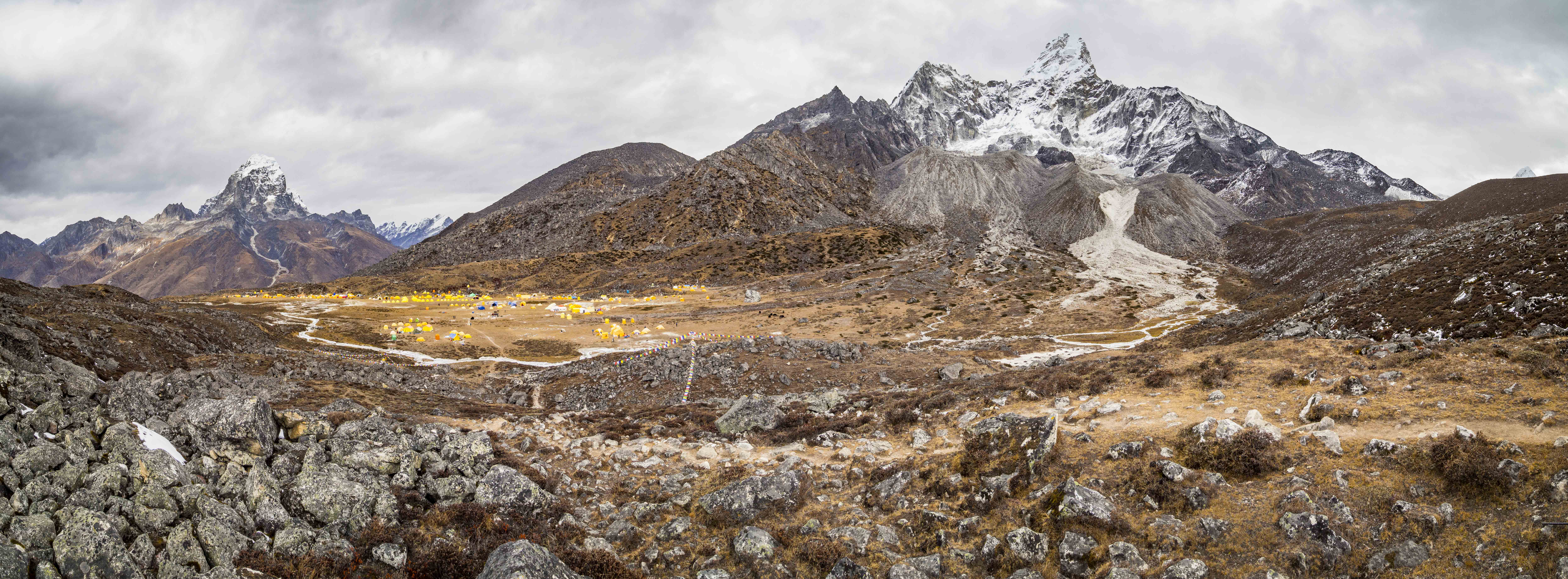 Kolejny dzień aklimatyzacyjny, tym razem na odrobinę wyższej wysokości. Rano zjadamy największą porcję makaronu ever i po krótkiej przerwie na zawiązanie sadełka maszerujemy do góry. Choć jesteśmy już bardzo blisko Everestu, ten, co już staje się tradycją, jest zasłonięty chmurami. Wokół jednak pełno innych ośnieżonych kolosów, które umilają nam szlak. Za plecami piętrzą się nam Cholatse (6440 m.n.p.m.) oraz Taboche (6495 m.n.p.m.), po prawej widzimy zachodnie, zupełnie inne oblicze Ama Dablam, w oddali (chyba) majaczy Makalu (8463 m.n.p.m.). Spektakularna sceneria, której uroku dodają napływające chmury, ponad wysokością których maszerujemy.