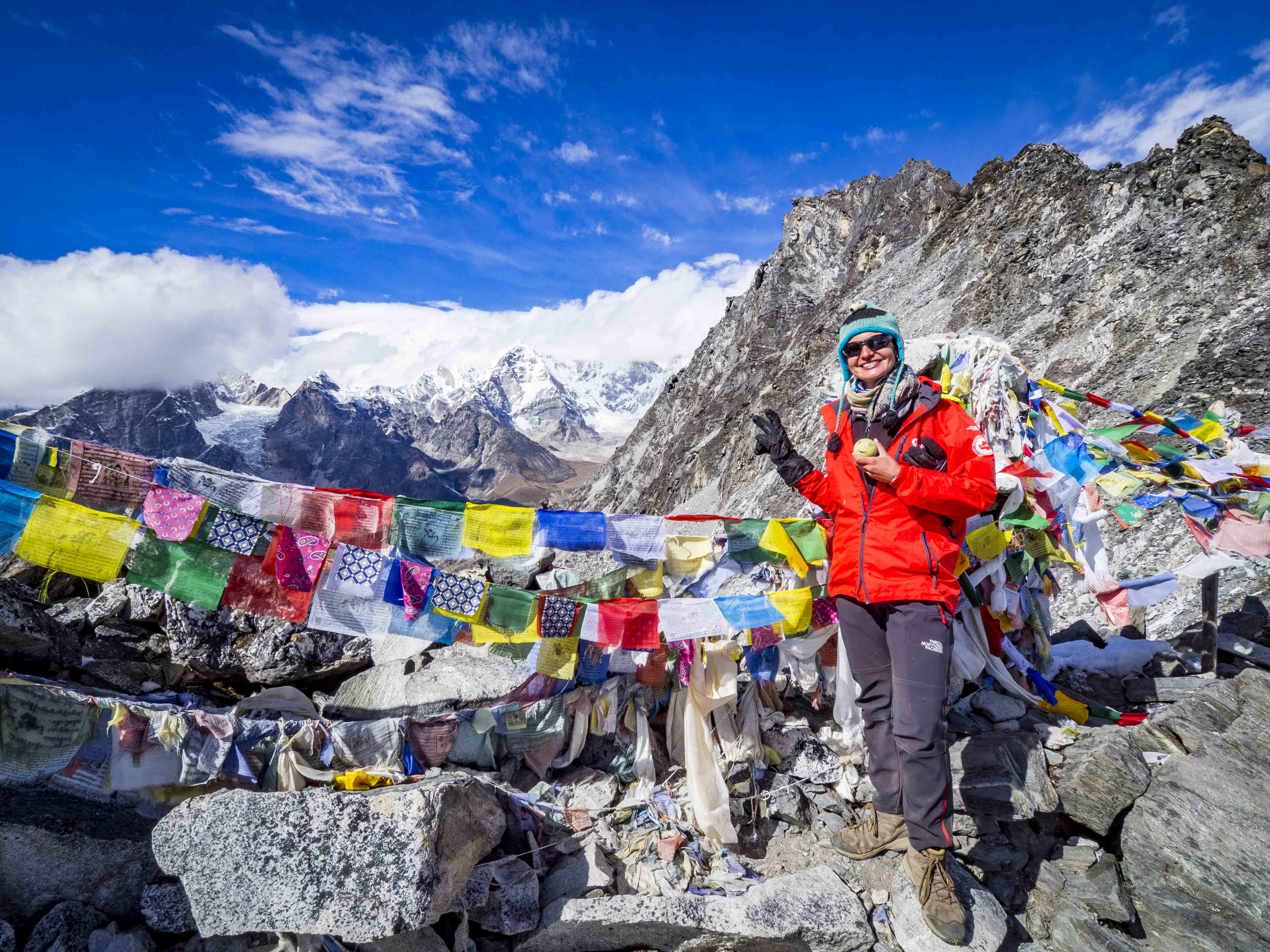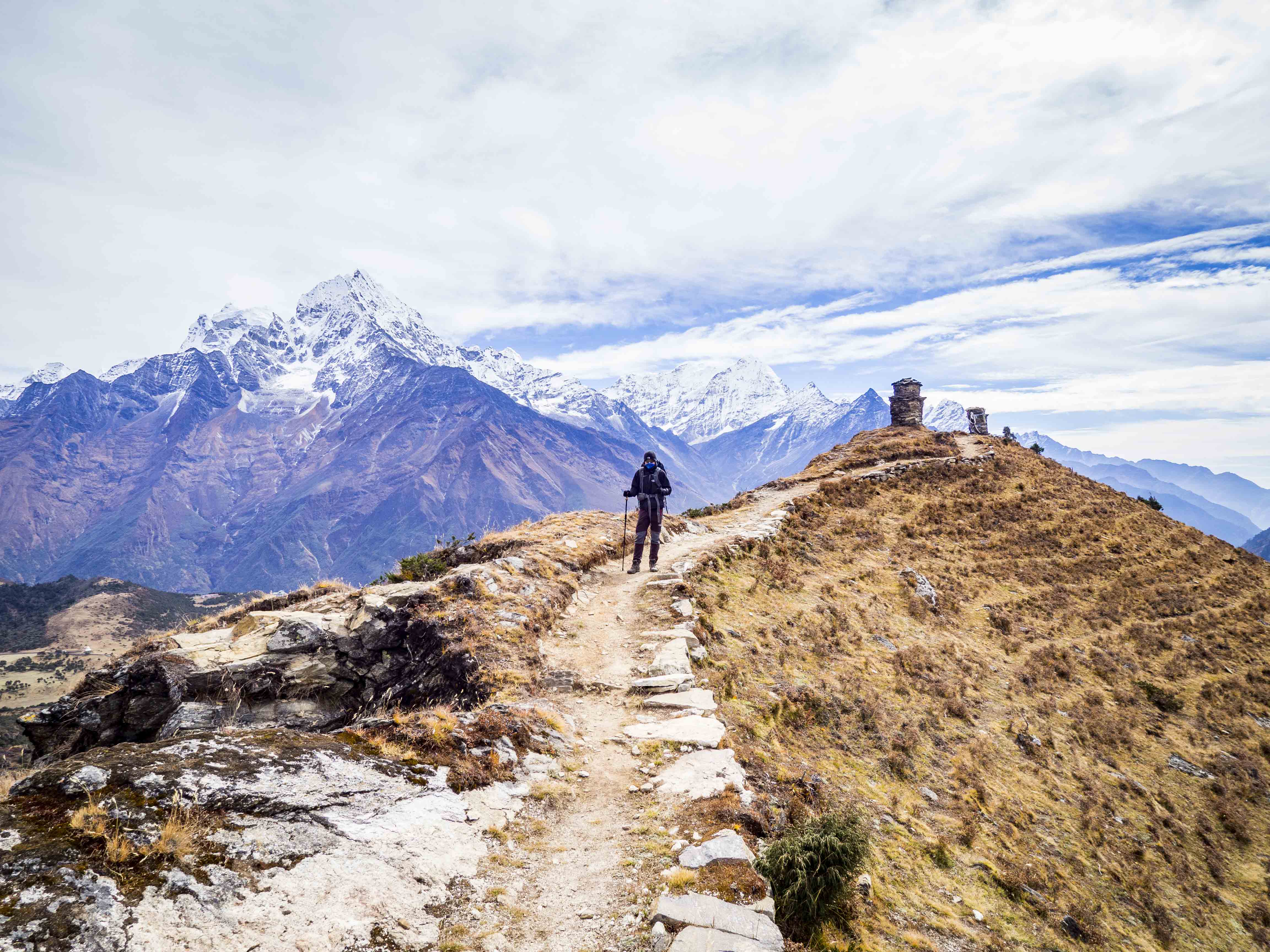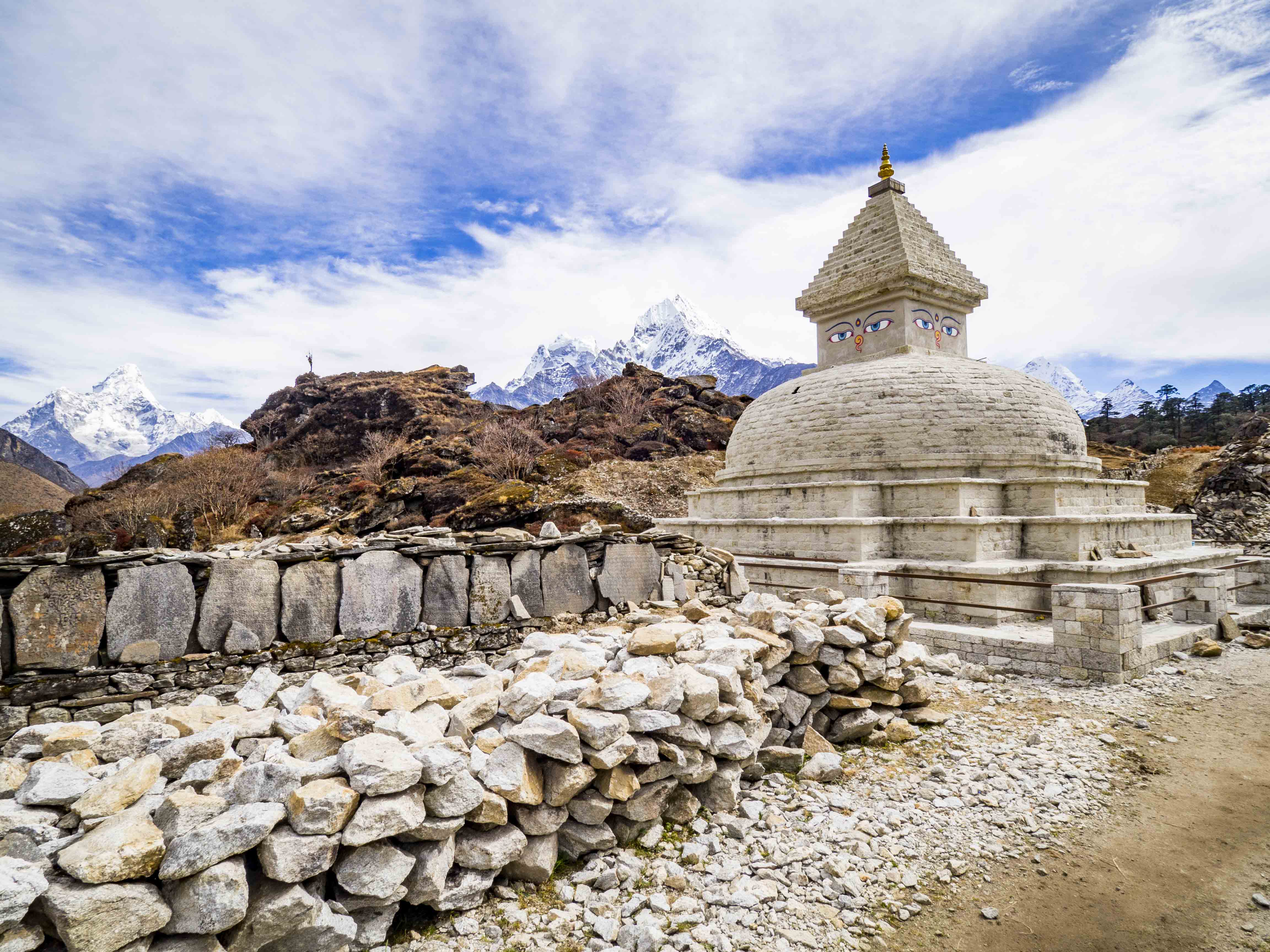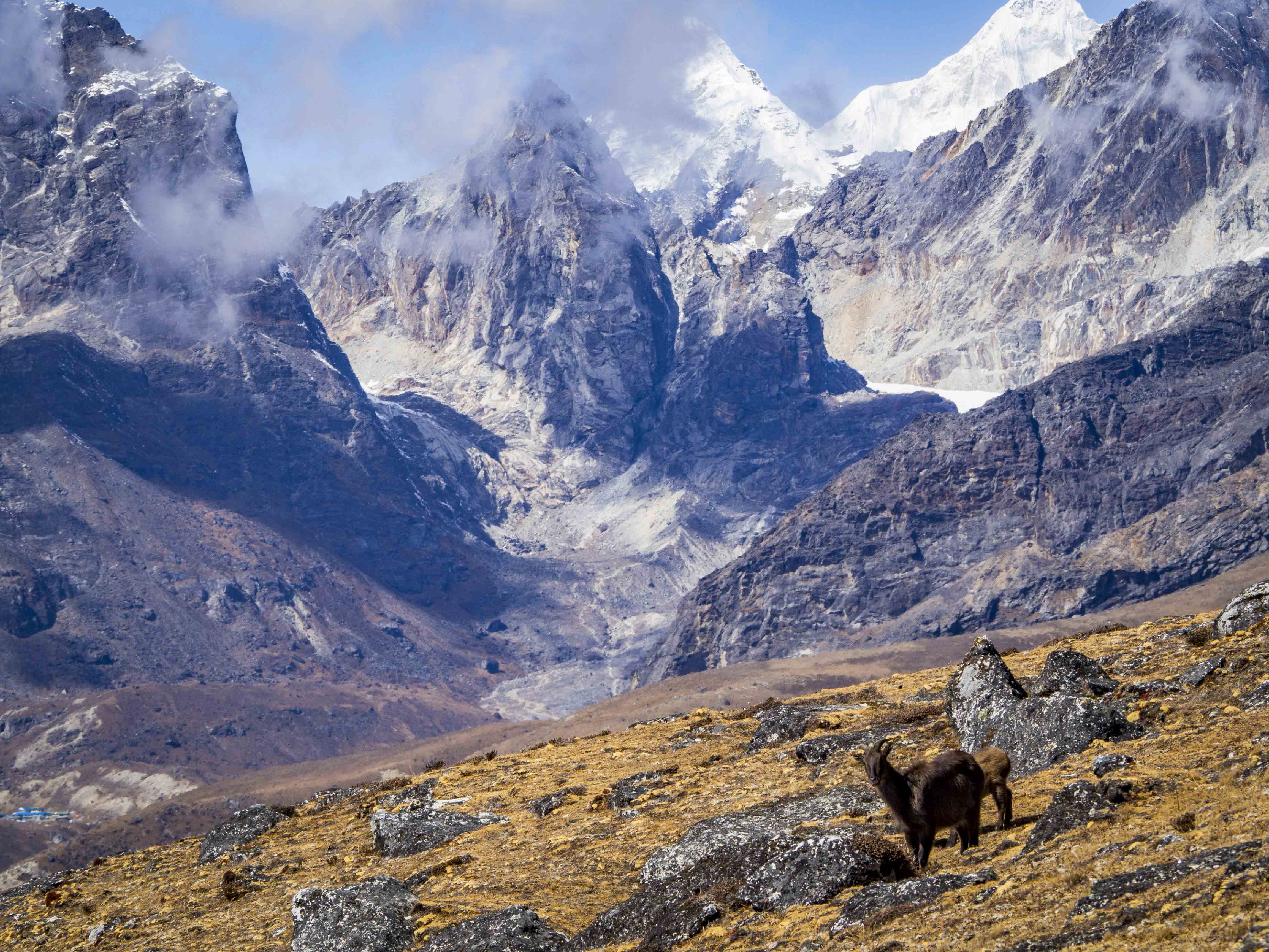 Kolejny dzień aklimatyzacyjny, tym razem na odrobinę wyższej wysokości. Rano zjadamy największą porcję makaronu ever i po krótkiej przerwie na zawiązanie sadełka maszerujemy do góry. Choć jesteśmy już bardzo blisko Everestu, ten, co już staje się tradycją, jest zasłonięty chmurami. Wokół jednak pełno innych ośnieżonych kolosów, które umilają nam szlak. Za plecami piętrzą się nam Cholatse (6440 m.n.p.m.) oraz Taboche (6495 m.n.p.m.), po prawej widzimy zachodnie, zupełnie inne oblicze Ama Dablam, w oddali (chyba) majaczy Makalu (8463 m.n.p.m.). Spektakularna sceneria, której uroku dodają napływające chmury, ponad wysokością których maszerujemy.