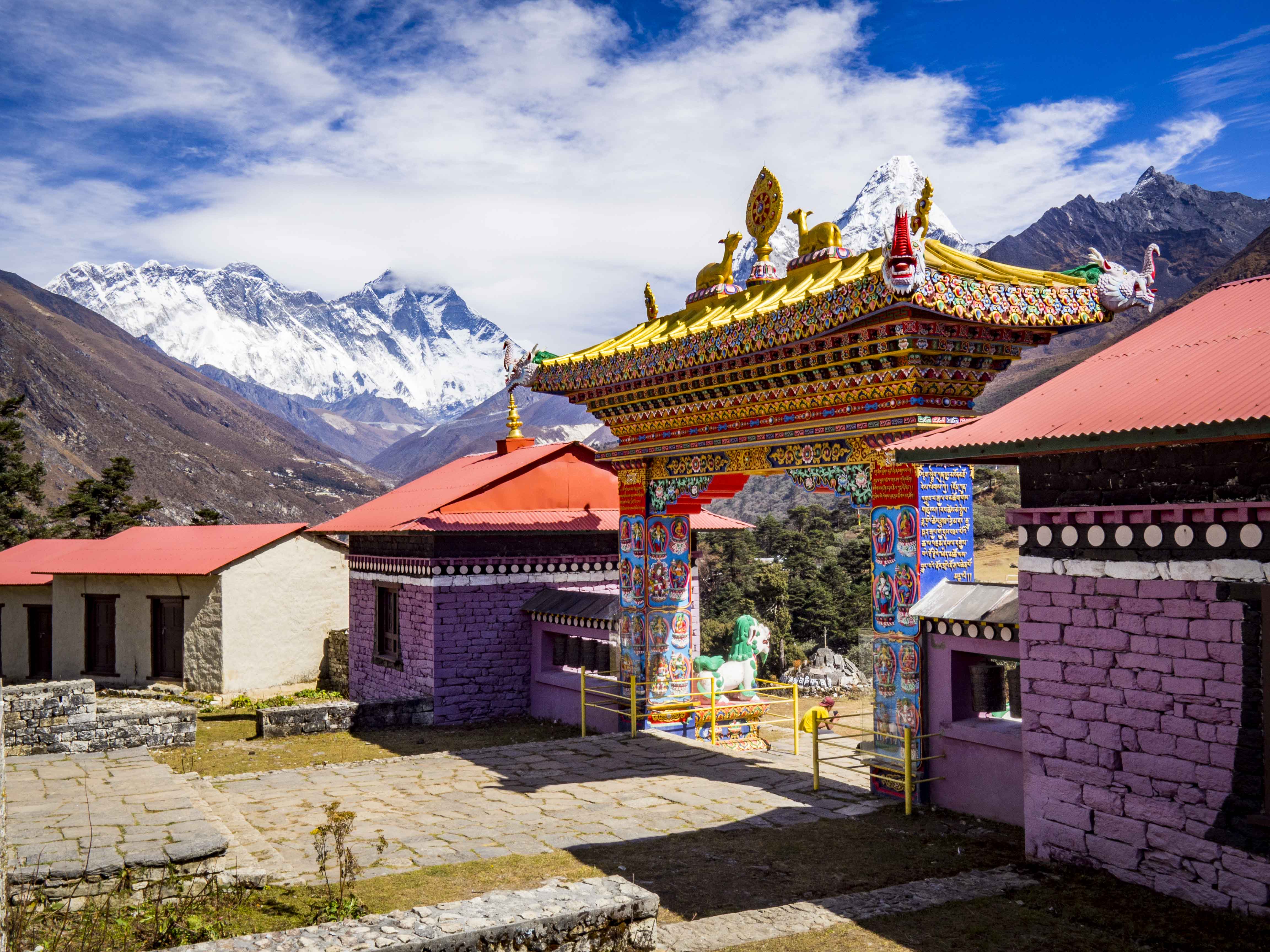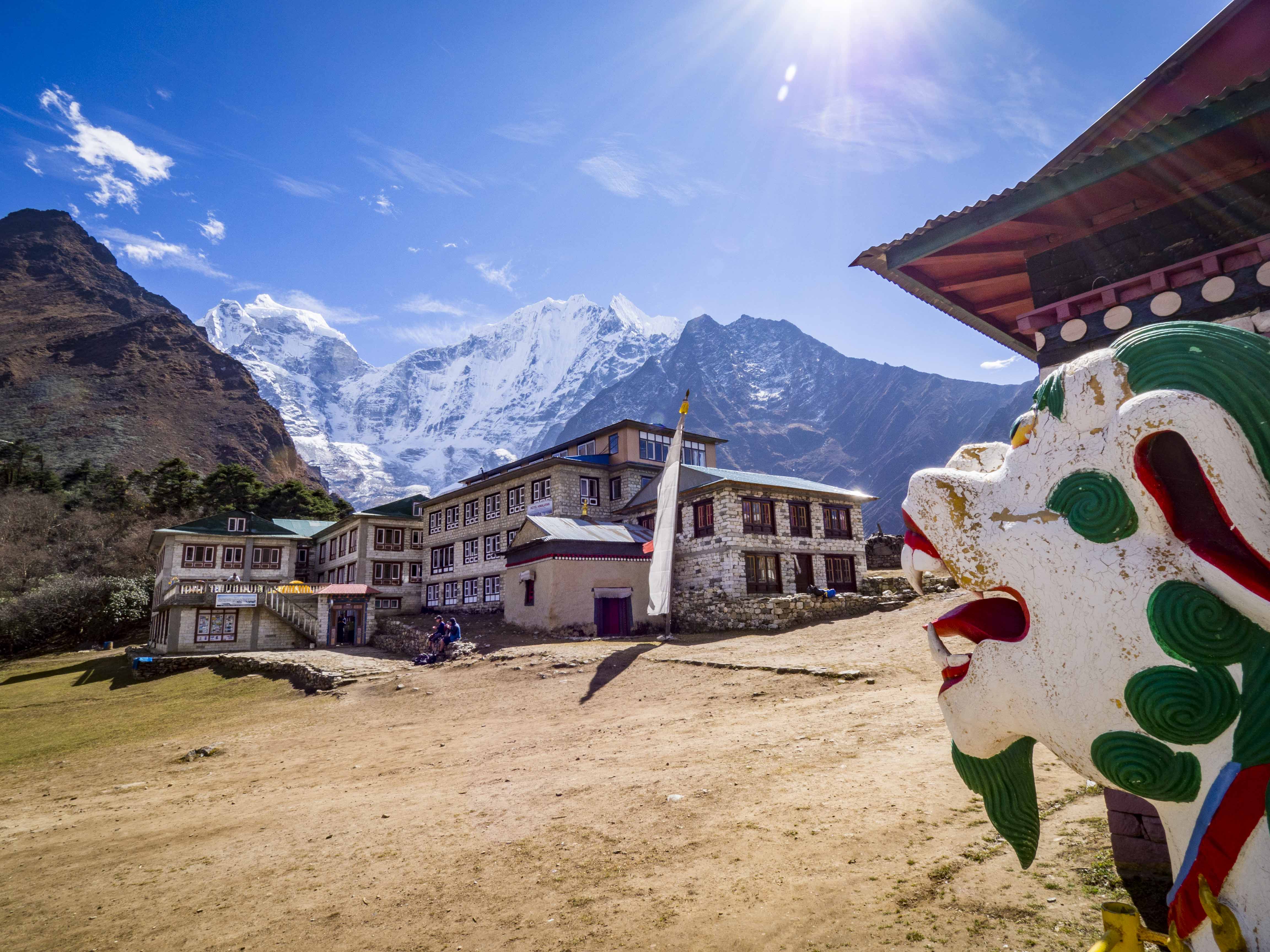 Do Tengboche dochodzimy przed 12. Jak się okazuje największa atrakcja wioski – buddyjski klasztor zamknięty jest akurat w godzinach 11-13. Nie wiemy, czy to zmowa mnichów z miejscową ludnością, ale jeśli tak to skuteczna. Na godzinę lądujemy na przymusowym dzbanku herbaty w jednym z guesthousów. Ciężko sobie wyobrazić lepszą, górską scenerię do wypicia 2 litrów mlecznej herbaty. 🙂