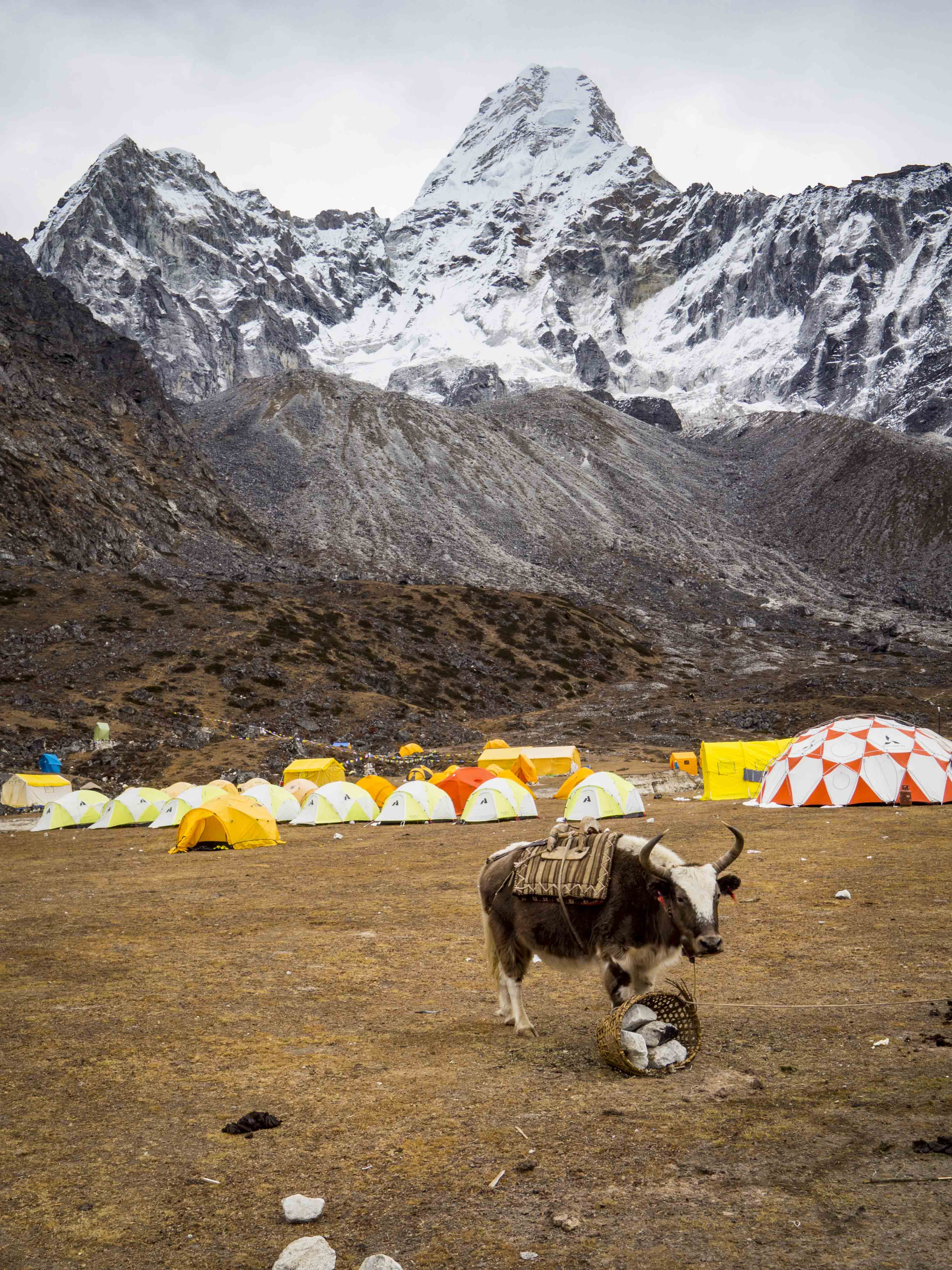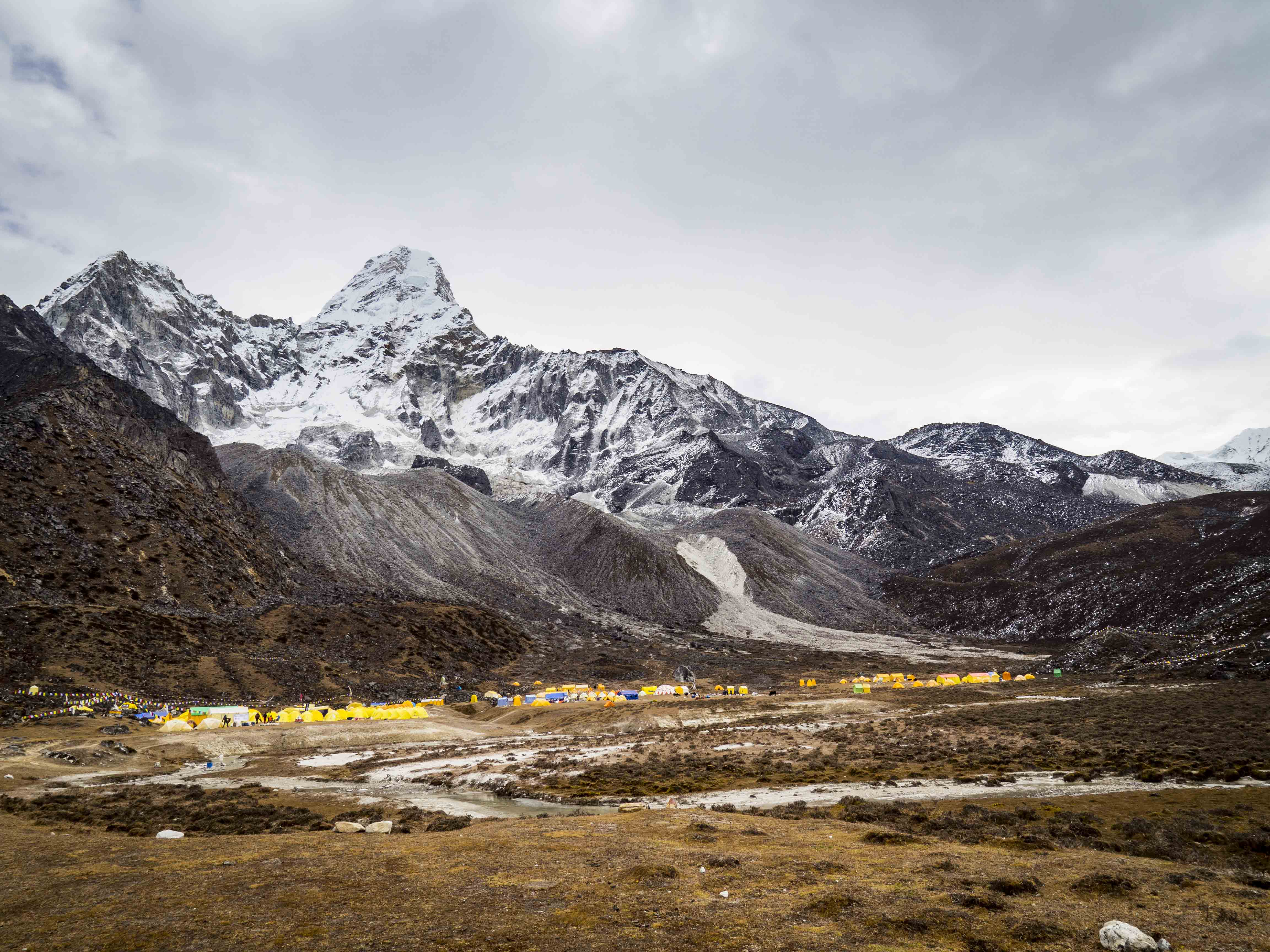 By rozpocząć podejście do base campu po raz kolejny musimy wytracić wysokość przekraczając rzekę. 700 m wspinaczki w chłodzie do najprzyjemniejszych nie należy, ale w końcu docieramy do celu. Na horyzoncie widać jakąś setkę namiotów, w których śmiałkowie aklimatyzują się przed zdobyciem szczytu. Nad naszymi głowami co rusz przelatują helikoptery, które zabierają tych, którzy atak szczytowy mają już za sobą.