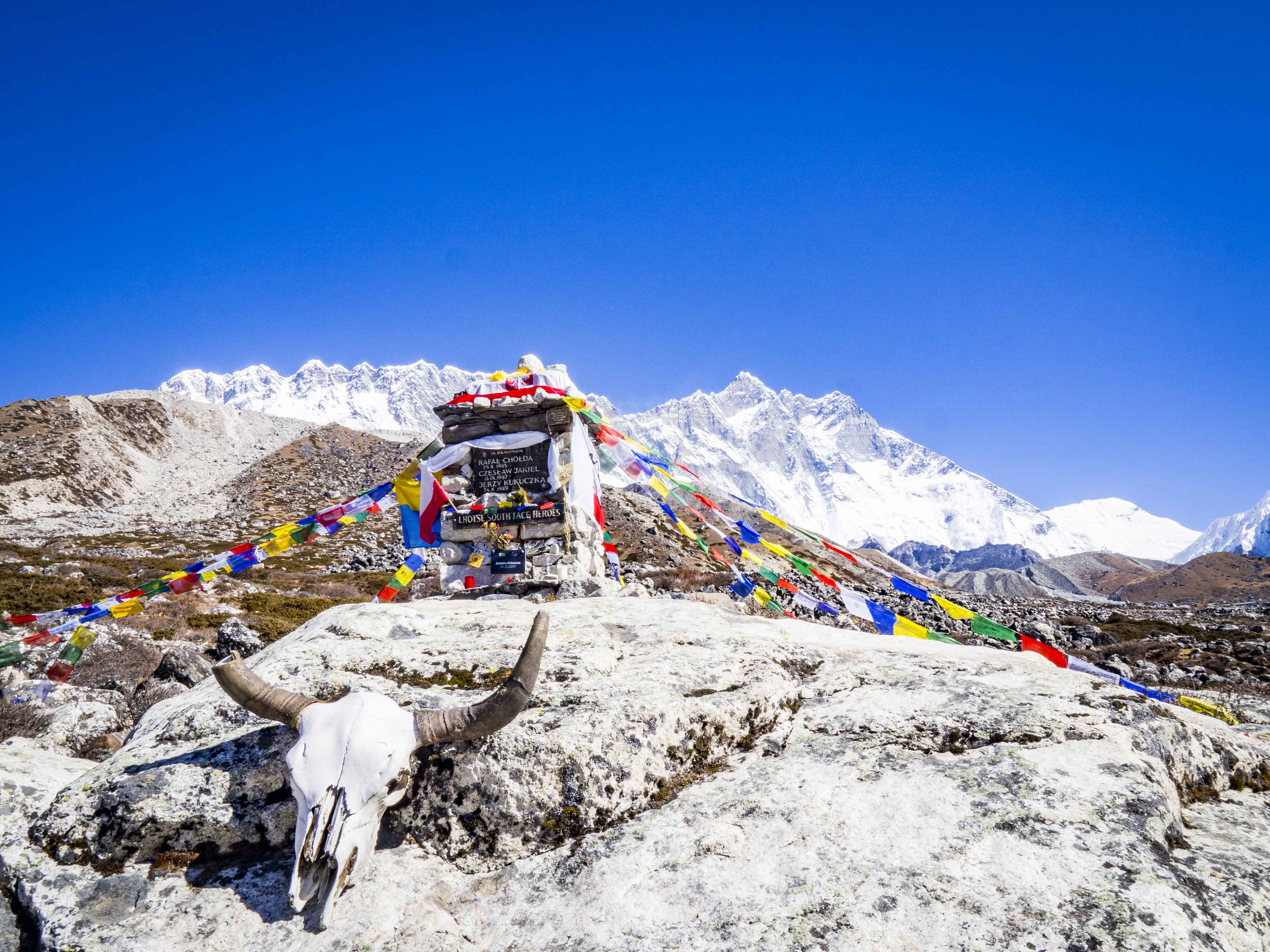 Obieramy cel na położony 500 m wyżej szczyt Kala Pattar. Droga upływa nam naprawdę w niemałym zachwycie widokiem Nuptse, który swoim pięknem dominuje wszystko inne. Wejście, które jeszcze kilka dni temu zajęłoby nam najpewniej 3-4 godziny, dziś trwa jedynie półtorej. Pomimo wczesnej pory, na szczycie nie bawimy długo, przejmujący, lodowaty wiatr sprawia, że chcemy być jak najprędzej na dole. Dużo mówi się o komercji wypraw na Mt Everest, że za 30 tyś. USD szerpowie na szczyt wprowadzą każdego. Jest w tym pewnie dużo prawdy, jednak i tak szczerze podziwiamy tych śmiałków – przeżycie kilku tygodni na tych wysokościach, w przejmującym zimnie to na pewno nie przelewki.