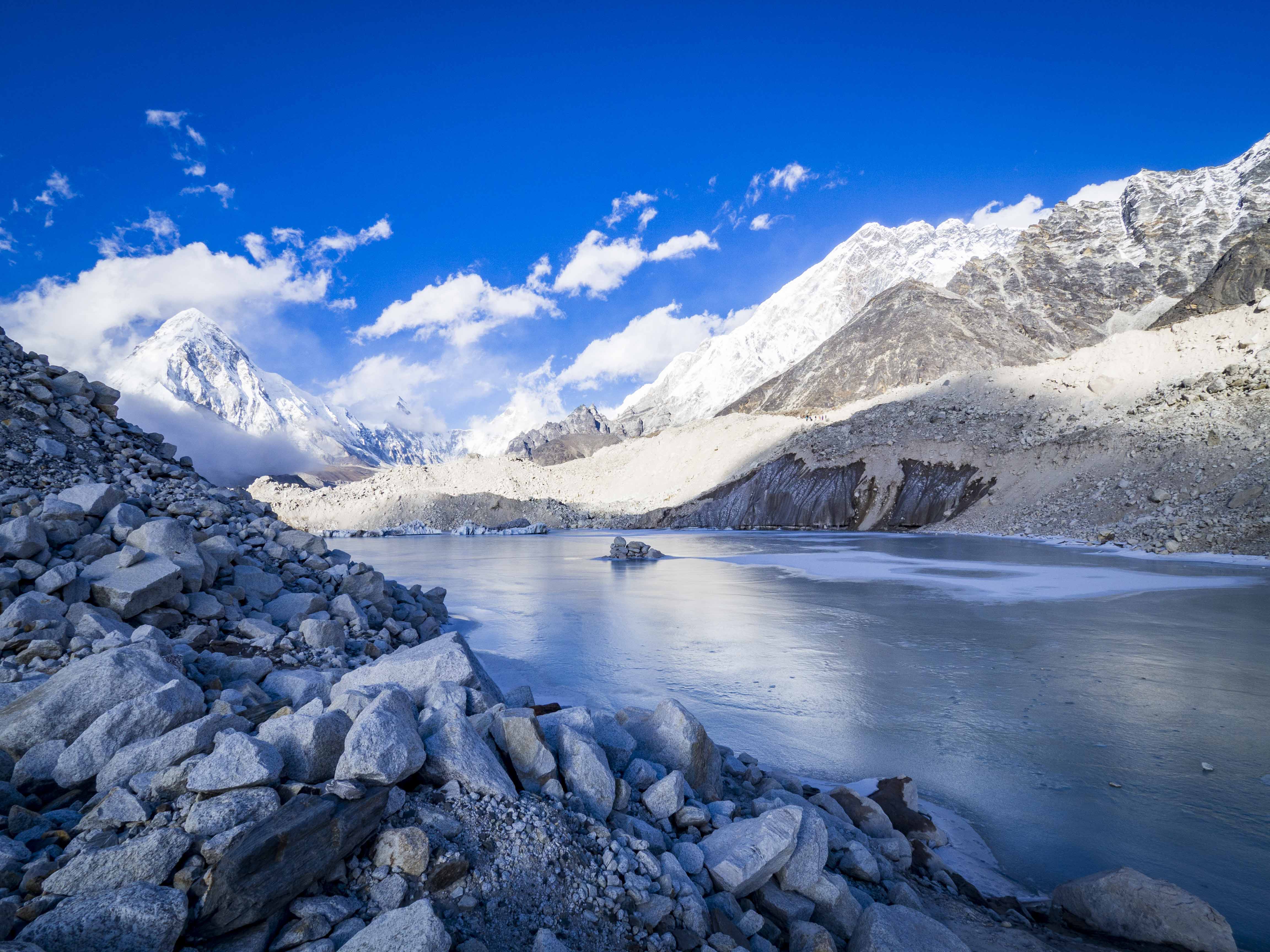 Nie wiadomo, czy nie posłużył nam ten odpoczynek, czy mimo wszystko to wina zmiany wysokości, ale maszeruje nam się dość nieciekawie. Na tyle nieciekawie, że poprzestajemy na widoku jeziora Imja i olewamy wizytę przy namiotach base campu, które znajdują się 1,5 km dalej. Okazuje się to słusznym ruchem – w drodze powrotnej nad górami zbiera się czarna mgła i robi się konkretnie zimno.