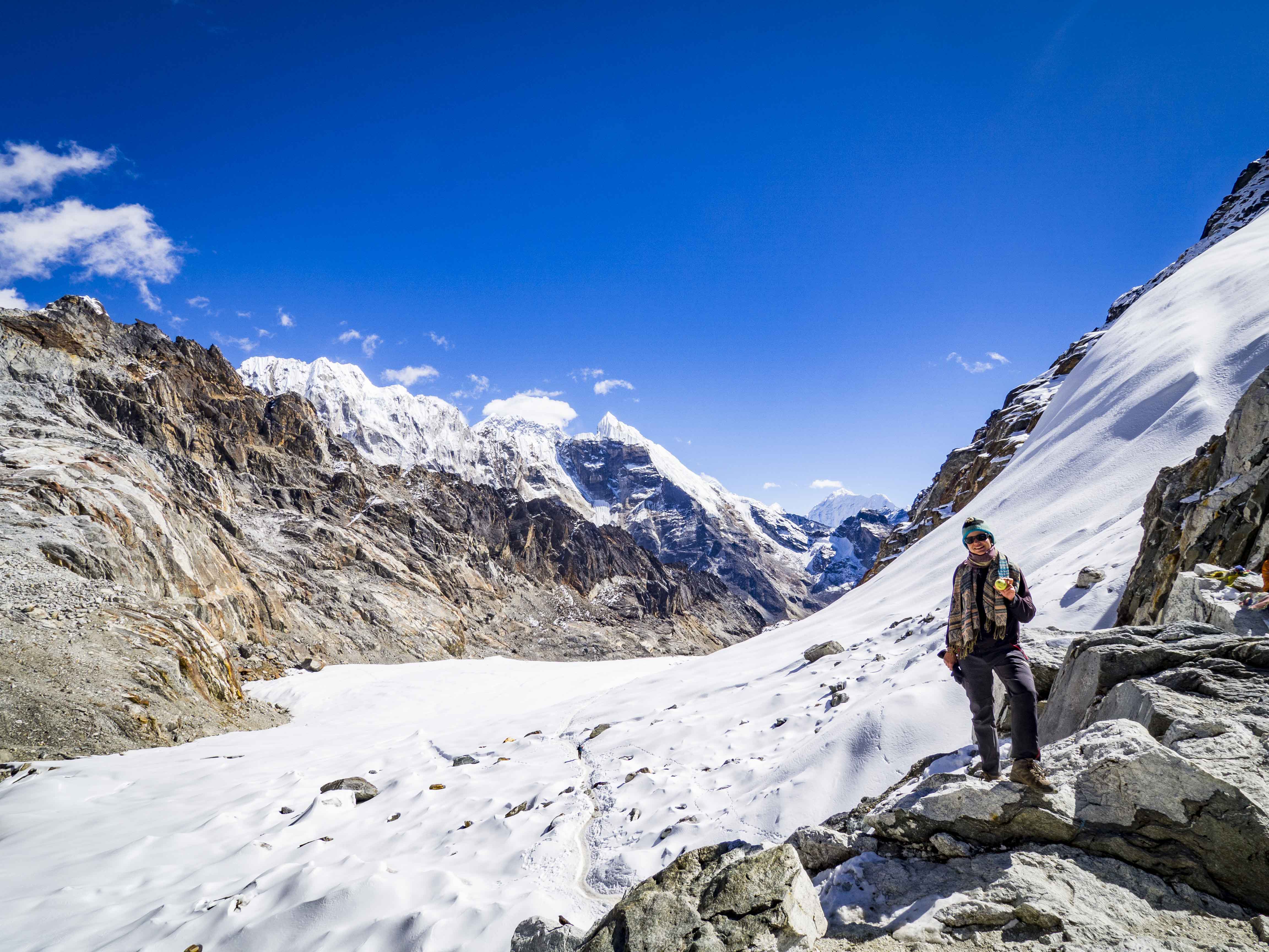 Za nami chyba najzimniejsza noc ever, w nocy w naszym pokoju musiało być kilka stopni na minusie. Tym szybciej więc zbieramy się na trasę, dziś do pokonania mamy drugą z przełęczy – Cho La. Mimo że jest bliżej miejsca startowego, wydaje nam się cięższa niż ta pierwsza (Kongma La) – na stromych zboczach jest sporo ruchomych kamieni. Dodatkowo tuż przed przełęczą przez półtora kilometra podążamy ośnieżoną częścią lodowca – po raz pierwszy wykorzystujemy mikrokolce, które targamy ze sobą prawie od dwóch tygodni. Dalibyśmy pewnie radę i bez nich (szerpowie przekraczają lodowiec w trampkach) ale na pewno nasz marsz jest pewniejszy i szybszy. Co więcej, gdy idziemy po lodowcu nie pokrywa nas ubezpieczenie, więc chyba lepiej dmuchać na zimne (przyp. Monika). 😉